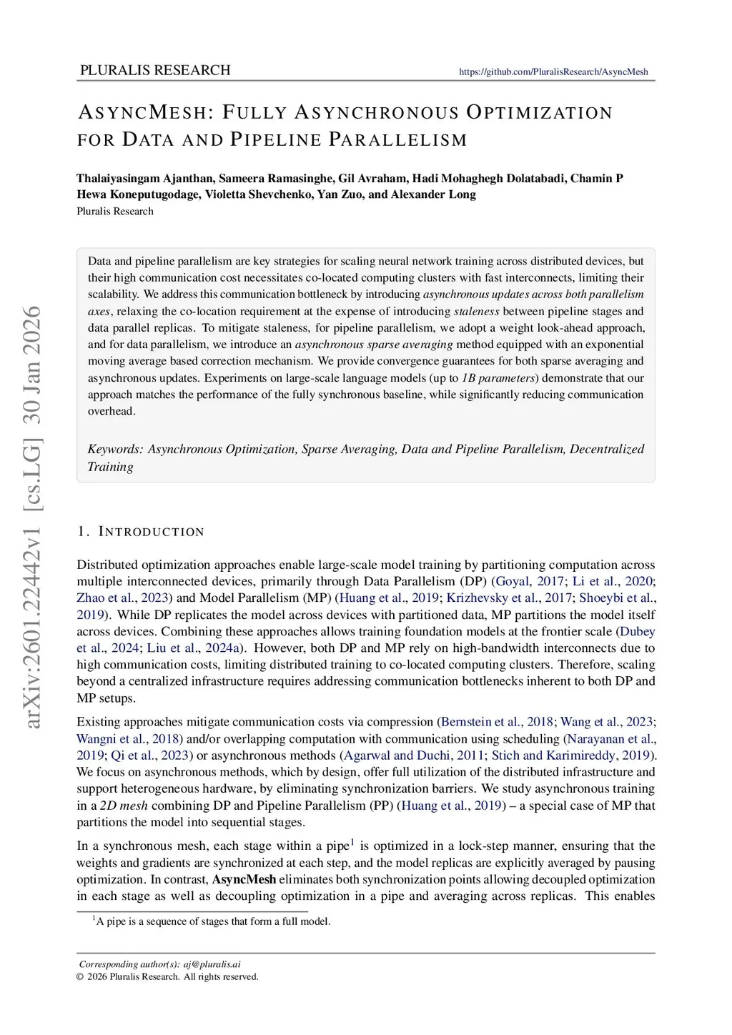 Data and pipeline parallelism are key strategies for scaling neural network training across distributed devices, but their high communication cost necessitates co-located computing clusters with fast interconnects, limiting their scalability. We address this communication bottleneck by introducing asynchronous updates across both parallelism axes, relaxing the co-location requirement at the expense of introducing staleness between pipeline stages and data parallel replicas. To mitigate staleness, for pipeline parallelism, we adopt a weight look-ahead approach, and for data parallelism, we introduce an asynchronous sparse averaging method equipped with an exponential moving average based correction mechanism. We provide convergence guarantees for both sparse averaging and asynchronous updates. Experiments on large-scale language models (up to \em 1B parameters) demonstrate that our approach matches the performance of the fully synchronous baseline, while significantly reducing communication overhead.