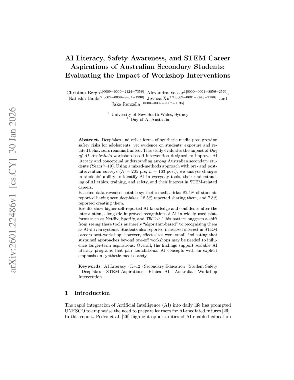 Deepfakes and other forms of synthetic media pose growing safety risks for adolescents, yet evidence on students' exposure and related behaviours remains limited. This study evaluates the impact of Day of AI Australia's workshop-based intervention designed to improve AI literacy and conceptual understanding among Australian secondary students (Years 7-10). Using a mixed-methods approach with pre- and post-intervention surveys (N=205 pre; N=163 post), we analyse changes in students' ability to identify AI in everyday tools, their understanding of AI ethics, training, and safety, and their interest in STEM-related careers.Baseline data revealed notable synthetic media risks: 82.4% of students reported having seen deepfakes, 18.5% reported sharing them, and 7.3% reported creating them.Results show higher self-reported AI knowledge and confidence after the intervention, alongside improved recognition of AI in widely used platforms such as Netflix, Spotify, and TikTok. This pattern suggests a shift from seeing these tools as merely "algorithm-based" to recognising them as AI-driven systems. Students also reported increased interest in STEM careers post-workshop; however, effect sizes were small, indicating that sustained approaches beyond one-off workshops may be needed to influence longer-term aspirations. Overall, the findings support scalable AI literacy programs that pair foundational AI concepts with an explicit emphasis on synthetic media safety.