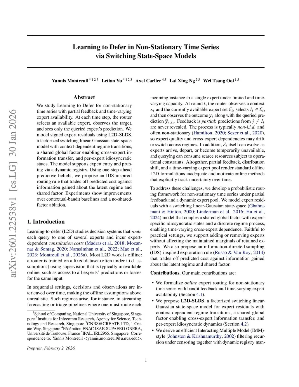 We study Learning to Defer for non-stationary time series with partial feedback and time-varying expert availability. At each time step, the router selects an available expert, observes the target, and sees only the queried expert's prediction. We model signed expert residuals using L2D-SLDS, a factorized switching linear-Gaussian state-space model with context-dependent regime transitions, a shared global factor enabling cross-expert information transfer, and per-expert idiosyncratic states. The model supports expert entry and pruning via a dynamic registry. Using one-step-ahead predictive beliefs, we propose an IDS-inspired routing rule that trades off predicted cost against information gained about the latent regime and shared factor. Experiments show improvements over contextual-bandit baselines and a no-shared-factor ablation.
