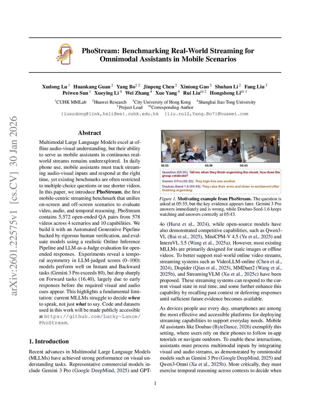 Multimodal Large Language Models excel at offline audio-visual understanding, but their ability to serve as mobile assistants in continuous real-world streams remains underexplored. In daily phone use, mobile assistants must track streaming audio-visual inputs and respond at the right time, yet existing benchmarks are often restricted to multiple-choice questions or use shorter videos. In this paper, we introduce PhoStream, the first mobile-centric streaming benchmark that unifies on-screen and off-screen scenarios to evaluate video, audio, and temporal reasoning. PhoStream contains 5,572 open-ended QA pairs from 578 videos across 4 scenarios and 10 capabilities. We build it with an Automated Generative Pipeline backed by rigorous human verification, and evaluate models using a realistic Online Inference Pipeline and LLM-as-a-Judge evaluation for open-ended responses. Experiments reveal a temporal asymmetry in LLM-judged scores (0-100): models perform well on Instant and Backward tasks (Gemini 3 Pro exceeds 80), but drop sharply on Forward tasks (16.40), largely due to early responses before the required visual and audio cues appear. This highlights a fundamental limitation: current MLLMs struggle to decide when to speak, not just what to say. Code and datasets used in this work will be made publicly accessible atthis https URL.