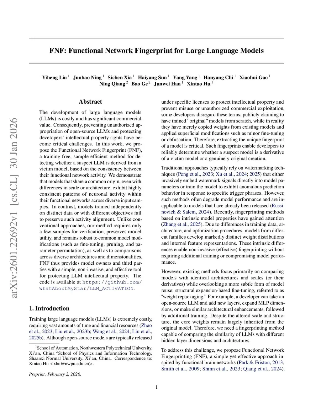FNF: Functional Network Fingerprint for Large Language Models