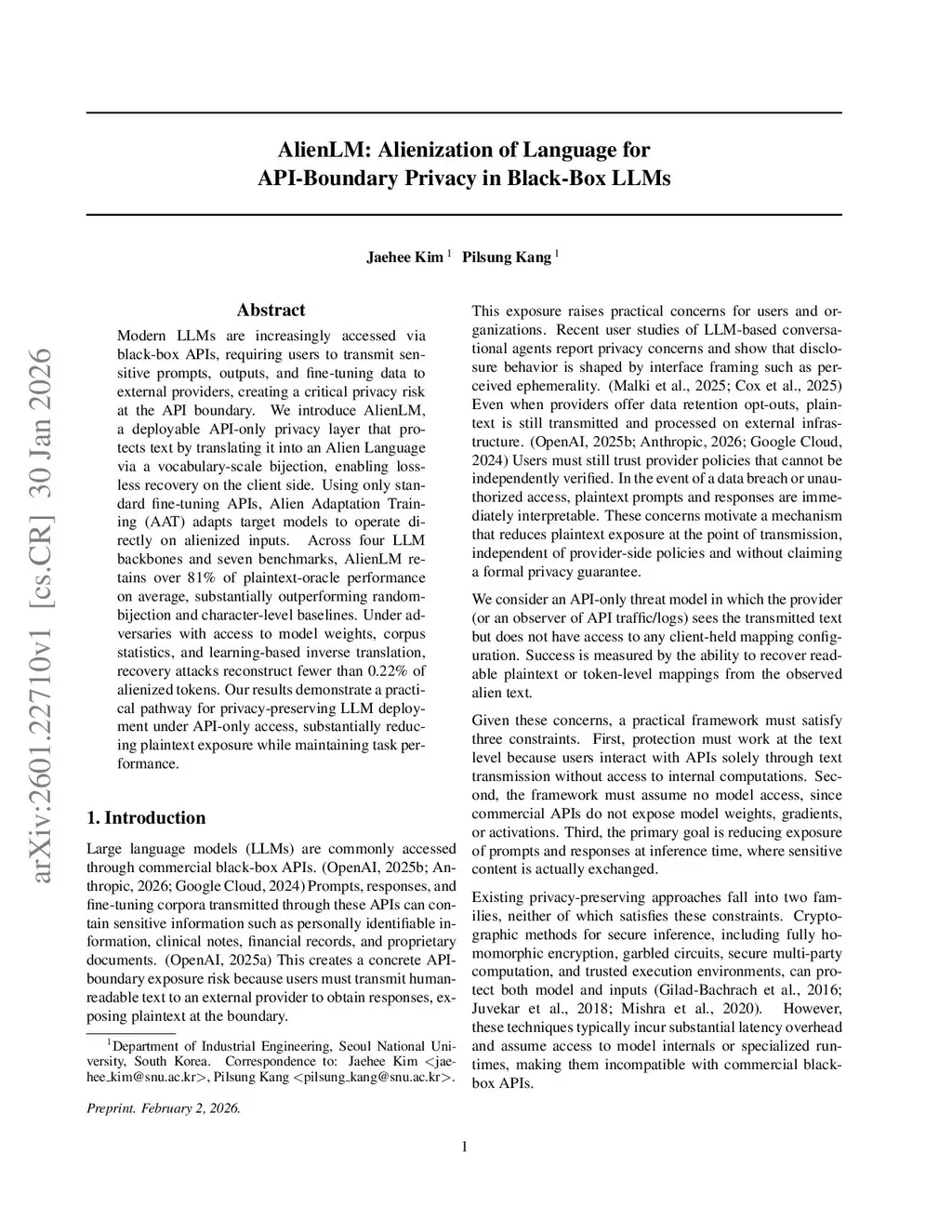 Modern LLMs are increasingly accessed via black-box APIs, requiring users to transmit sensitive prompts, outputs, and fine-tuning data to external providers, creating a critical privacy risk at the API boundary. We introduce AlienLM, a deployable API-only privacy layer that protects text by translating it into an Alien Language via a vocabulary-scale bijection, enabling lossless recovery on the client side. Using only standard fine-tuning APIs, Alien Adaptation Training (AAT) adapts target models to operate directly on alienized inputs. Across four LLM backbones and seven benchmarks, AlienLM retains over 81\% of plaintext-oracle performance on average, substantially outperforming random-bijection and character-level baselines. Under adversaries with access to model weights, corpus statistics, and learning-based inverse translation, recovery attacks reconstruct fewer than 0.22\% of alienized tokens. Our results demonstrate a practical pathway for privacy-preserving LLM deployment under API-only access, substantially reducing plaintext exposure while maintaining task performance.