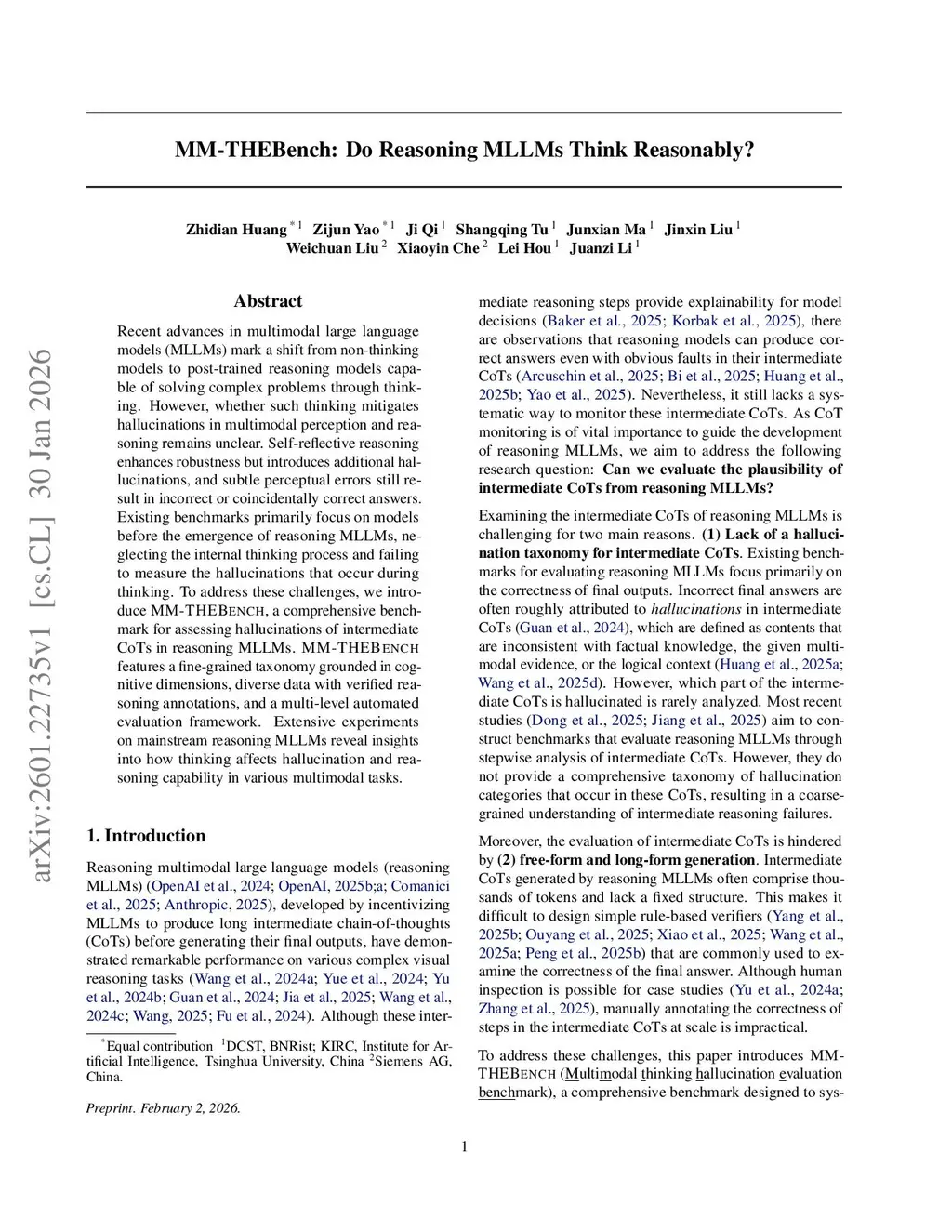 Recent advances in multimodal large language models (MLLMs) mark a shift from non-thinking models to post-trained reasoning models capable of solving complex problems through thinking. However, whether such thinking mitigates hallucinations in multimodal perception and reasoning remains unclear. Self-reflective reasoning enhances robustness but introduces additional hallucinations, and subtle perceptual errors still result in incorrect or coincidentally correct answers. Existing benchmarks primarily focus on models before the emergence of reasoning MLLMs, neglecting the internal thinking process and failing to measure the hallucinations that occur during thinking. To address these challenges, we introduce MM-THEBench, a comprehensive benchmark for assessing hallucinations of intermediate CoTs in reasoning MLLMs. MM-THEBench features a fine-grained taxonomy grounded in cognitive dimensions, diverse data with verified reasoning annotations, and a multi-level automated evaluation framework. Extensive experiments on mainstream reasoning MLLMs reveal insights into how thinking affects hallucination and reasoning capability in various multimodal tasks.