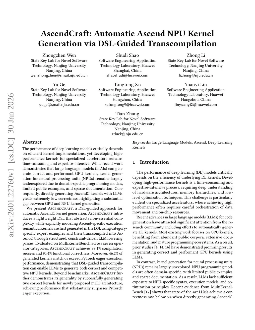 The performance of deep learning models critically depends on efficient kernel implementations, yet developing high-performance kernels for specialized accelerators remains time-consuming and expertise-intensive. While recent work demonstrates that large language models (LLMs) can generate correct and performant GPU kernels, kernel generation for neural processing units (NPUs) remains largely underexplored due to domain-specific programming models, limited public examples, and sparse documentation. Consequently, directly generating AscendC kernels with LLMs yields extremely low correctness, highlighting a substantial gap between GPU and NPU kernel generation.We present AscendCraft, a DSL-guided approach for automatic AscendC kernel generation. AscendCraft introduces a lightweight DSL that abstracts non-essential complexity while explicitly modeling Ascend-specific execution semantics. Kernels are first generated in the DSL using category-specific expert examples and then transcompiled into AscendC through structured, constraint-driven LLM lowering passes. Evaluated on MultiKernelBench across seven operator categories, AscendCraft achieves 98.1% compilation success and 90.4% functional correctness. Moreover, 46.2% of generated kernels match or exceed PyTorch eager execution performance, demonstrating that DSL-guided transcompilation can enable LLMs to generate both correct and competitive NPU kernels. Beyond benchmarks, AscendCraft further demonstrates its generality by successfully generating two correct kernels for newly proposed mHC architecture, achieving performance that substantially surpasses PyTorch eager execution.