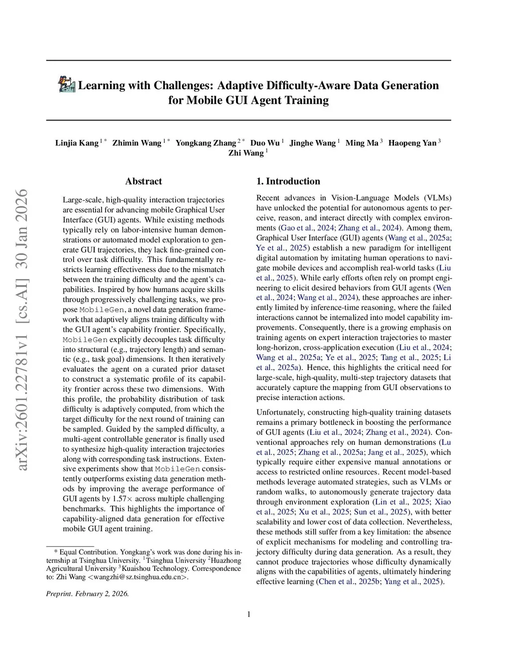 Large-scale, high-quality interaction trajectories are essential for advancing mobile Graphical User Interface (GUI) agents. While existing methods typically rely on labor-intensive human demonstrations or automated model exploration to generate GUI trajectories, they lack fine-grained control over task difficulty. This fundamentally restricts learning effectiveness due to the mismatch between the training difficulty and the agent's capabilities. Inspired by how humans acquire skills through progressively challenging tasks, we propose MobileGen, a novel data generation framework that adaptively aligns training difficulty with the GUI agent's capability frontier. Specifically, MobileGen explicitly decouples task difficulty into structural (e.g., trajectory length) and semantic (e.g., task goal) dimensions. It then iteratively evaluates the agent on a curated prior dataset to construct a systematic profile of its capability frontier across these two dimensions. With this profile, the probability distribution of task difficulty is adaptively computed, from which the target difficulty for the next round of training can be sampled. Guided by the sampled difficulty, a multi-agent controllable generator is finally used to synthesize high-quality interaction trajectories along with corresponding task instructions. Extensive experiments show that MobileGen consistently outperforms existing data generation methods by improving the average performance of GUI agents by 1.57 times across multiple challenging benchmarks. This highlights the importance of capability-aligned data generation for effective mobile GUI agent training.