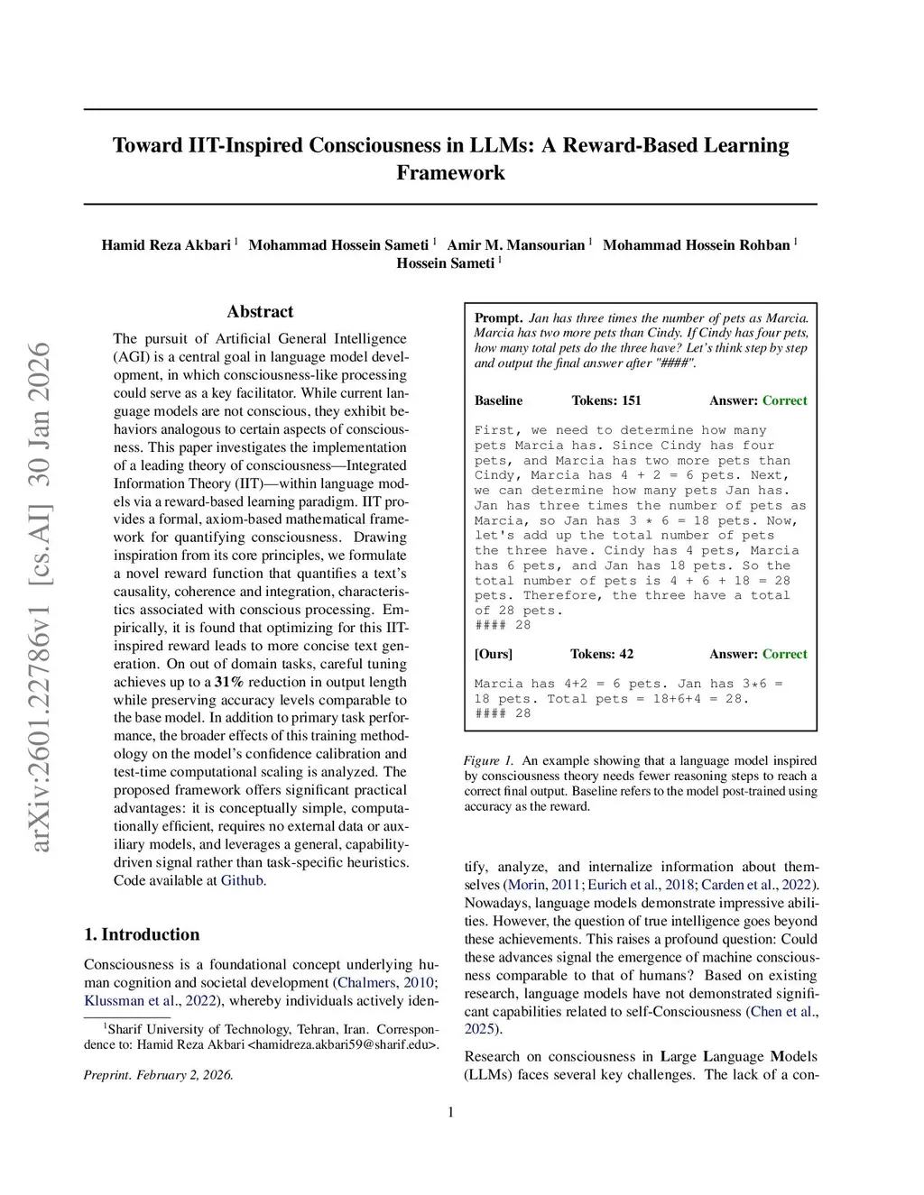 The pursuit of Artificial General Intelligence (AGI) is a central goal in language model development, in which consciousness-like processing could serve as a key facilitator. While current language models are not conscious, they exhibit behaviors analogous to certain aspects of consciousness. This paper investigates the implementation of a leading theory of consciousness, Integrated Information Theory (IIT), within language models via a reward-based learning paradigm. IIT provides a formal, axiom-based mathematical framework for quantifying consciousness. Drawing inspiration from its core principles, we formulate a novel reward function that quantifies a text's causality, coherence and integration, characteristics associated with conscious processing. Empirically, it is found that optimizing for this IIT-inspired reward leads to more concise text generation. On out of domain tasks, careful tuning achieves up to a 31% reduction in output length while preserving accuracy levels comparable to the base model. In addition to primary task performance, the broader effects of this training methodology on the model's confidence calibration and test-time computational scaling is analyzed. The proposed framework offers significant practical advantages: it is conceptually simple, computationally efficient, requires no external data or auxiliary models, and leverages a general, capability-driven signal rather than task-specific heuristics. Code available atthis https URL