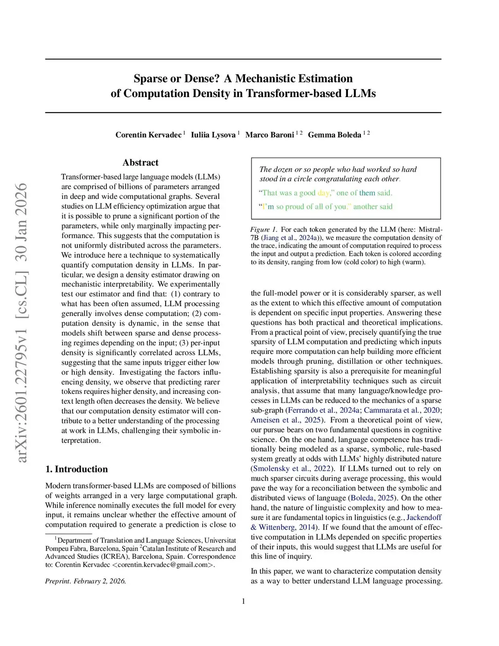 Transformer-based large language models (LLMs) are comprised of billions of parameters arranged in deep and wide computational graphs. Several studies on LLM efficiency optimization argue that it is possible to prune a significant portion of the parameters, while only marginally impacting performance. This suggests that the computation is not uniformly distributed across the parameters. We introduce here a technique to systematically quantify computation density in LLMs. In particular, we design a density estimator drawing on mechanistic interpretability. We experimentally test our estimator and find that: (1) contrary to what has been often assumed, LLM processing generally involves dense computation; (2) computation density is dynamic, in the sense that models shift between sparse and dense processing regimes depending on the input; (3) per-input density is significantly correlated across LLMs, suggesting that the same inputs trigger either low or high density. Investigating the factors influencing density, we observe that predicting rarer tokens requires higher density, and increasing context length often decreases the density. We believe that our computation density estimator will contribute to a better understanding of the processing at work in LLMs, challenging their symbolic interpretation.