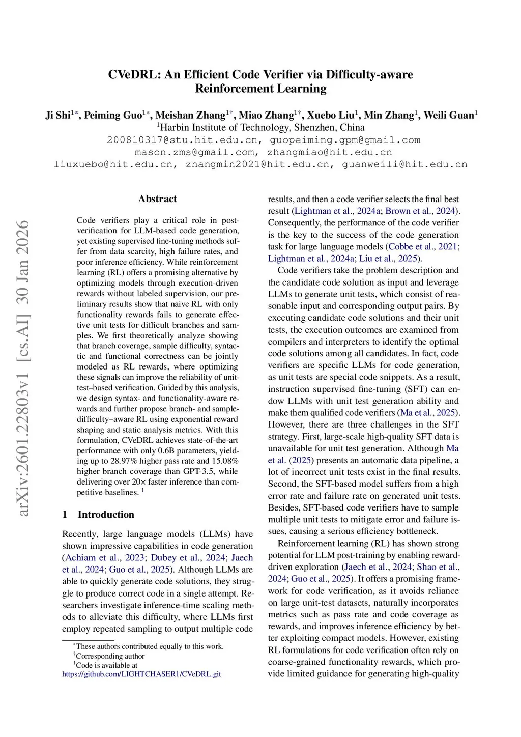 Code verifiers play a critical role in post-verification for LLM-based code generation, yet existing supervised fine-tuning methods suffer from data scarcity, high failure rates, and poor inference efficiency. While reinforcement learning (RL) offers a promising alternative by optimizing models through execution-driven rewards without labeled supervision, our preliminary results show that naive RL with only functionality rewards fails to generate effective unit tests for difficult branches and samples. We first theoretically analyze showing that branch coverage, sample difficulty, syntactic and functional correctness can be jointly modeled as RL rewards, where optimizing these signals can improve the reliability of unit-test-based verification. Guided by this analysis, we design syntax- and functionality-aware rewards and further propose branch- and sample-difficulty--aware RL using exponential reward shaping and static analysis metrics. With this formulation, CVeDRL achieves state-of-the-art performance with only 0.6B parameters, yielding up to 28.97% higher pass rate and 15.08% higher branch coverage than GPT-3.5, while delivering over faster inference than competitive baselines. Code is available atthis https URL