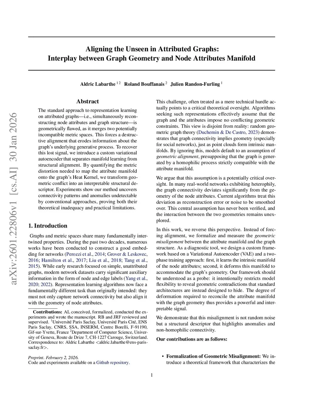 The standard approach to representation learning on attributed graphs -- i.e., simultaneously reconstructing node attributes and graph structure -- is geometrically flawed, as it merges two potentially incompatible metric spaces. This forces a destructive alignment that erodes information about the graph's underlying generative process. To recover this lost signal, we introduce a custom variational autoencoder that separates manifold learning from structural alignment. By quantifying the metric distortion needed to map the attribute manifold onto the graph's Heat Kernel, we transform geometric conflict into an interpretable structural descriptor. Experiments show our method uncovers connectivity patterns and anomalies undetectable by conventional approaches, proving both their theoretical inadequacy and practical limitations.