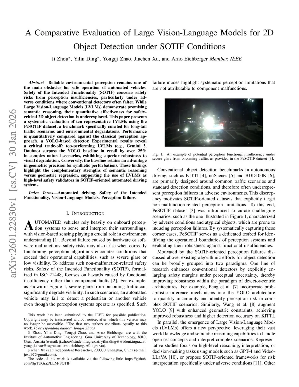 Reliable environmental perception remains one of the main obstacles for safe operation of automated vehicles. Safety of the Intended Functionality (SOTIF) concerns safety risks from perception insufficiencies, particularly under adverse conditions where conventional detectors often falter. While Large Vision-Language Models (LVLMs) demonstrate promising semantic reasoning, their quantitative effectiveness for safety-critical 2D object detection is underexplored. This paper presents a systematic evaluation of ten representative LVLMs using the PeSOTIF dataset, a benchmark specifically curated for long-tail traffic scenarios and environmental degradations. Performance is quantitatively compared against the classical perception approach, a YOLO-based detector. Experimental results reveal a critical trade-off: top-performing LVLMs (e.g., Gemini 3, Doubao) surpass the YOLO baseline in recall by over 25% in complex natural scenarios, exhibiting superior robustness to visual degradation. Conversely, the baseline retains an advantage in geometric precision for synthetic perturbations. These findings highlight the complementary strengths of semantic reasoning versus geometric regression, supporting the use of LVLMs as high-level safety validators in SOTIF-oriented automated driving systems.