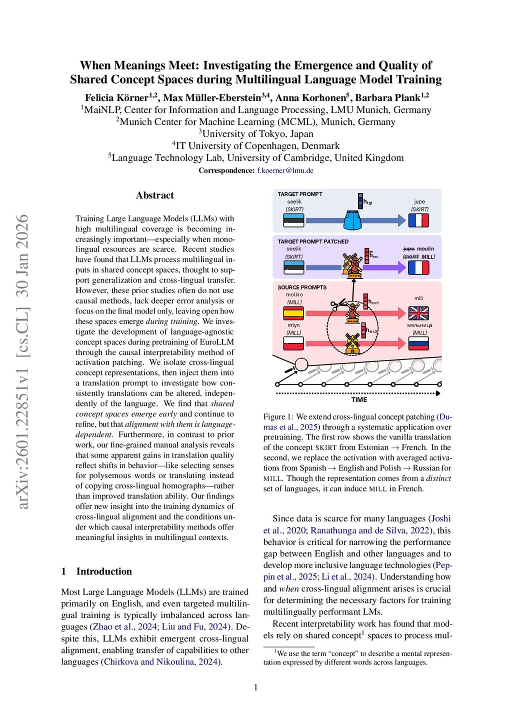 Training Large Language Models (LLMs) with high multilingual coverage is becoming increasingly important -- especially when monolingual resources are scarce. Recent studies have found that LLMs process multilingual inputs in shared concept spaces, thought to support generalization and cross-lingual transfer. However, these prior studies often do not use causal methods, lack deeper error analysis or focus on the final model only, leaving open how these spaces emerge during training. We investigate the development of language-agnostic concept spaces during pretraining of EuroLLM through the causal interpretability method of activation patching. We isolate cross-lingual concept representations, then inject them into a translation prompt to investigate how consistently translations can be altered, independently of the language. We find that shared concept spaces emerge early} and continue to refine, but that alignment with them is language-dependent}. Furthermore, in contrast to prior work, our fine-grained manual analysis reveals that some apparent gains in translation quality reflect shifts in behavior -- like selecting senses for polysemous words or translating instead of copying cross-lingual homographs -- rather than improved translation ability. Our findings offer new insight into the training dynamics of cross-lingual alignment and the conditions under which causal interpretability methods offer meaningful insights in multilingual contexts.