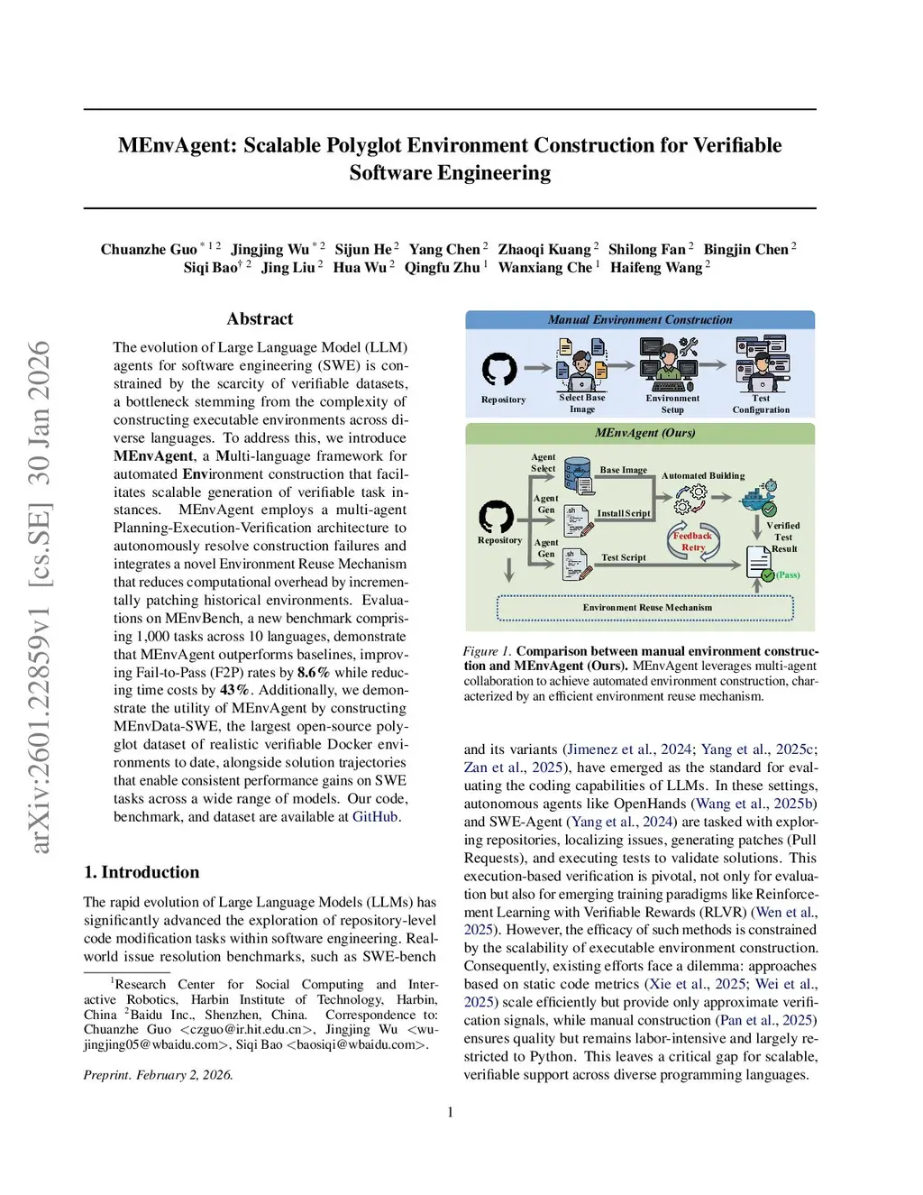 The evolution of Large Language Model (LLM) agents for software engineering (SWE) is constrained by the scarcity of verifiable datasets, a bottleneck stemming from the complexity of constructing executable environments across diverse languages. To address this, we introduce MEnvAgent, a Multi-language framework for automated Environment construction that facilitates scalable generation of verifiable task instances. MEnvAgent employs a multi-agent Planning-Execution-Verification architecture to autonomously resolve construction failures and integrates a novel Environment Reuse Mechanism that reduces computational overhead by incrementally patching historical environments. Evaluations on MEnvBench, a new benchmark comprising 1,000 tasks across 10 languages, demonstrate that MEnvAgent outperforms baselines, improving Fail-to-Pass (F2P) rates by 8.6% while reducing time costs by 43%. Additionally, we demonstrate the utility of MEnvAgent by constructing MEnvData-SWE, the largest open-source polyglot dataset of realistic verifiable Docker environments to date, alongside solution trajectories that enable consistent performance gains on SWE tasks across a wide range of models. Our code, benchmark, and dataset are available atthis https URL.