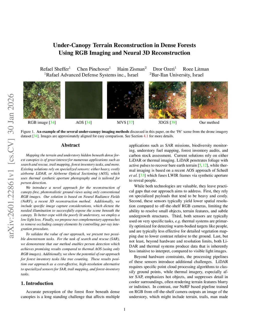 Mapping the terrain and understory hidden beneath dense forest canopies is of great interest for numerous applications such as search and rescue, trail mapping, forest inventory tasks, and more. Existing solutions rely on specialized sensors: either heavy, costly airborne LiDAR, or Airborne Optical Sectioning (AOS), which uses thermal synthetic aperture photography and is tailored for person detection.We introduce a novel approach for the reconstruction of canopy-free, photorealistic ground views using only conventional RGB images. Our solution is based on the celebrated Neural Radiance Fields (NeRF), a recent 3D reconstruction method. Additionally, we include specific image capture considerations, which dictate the needed illumination to successfully expose the scene beneath the canopy. To better cope with the poorly lit understory, we employ a low light loss. Finally, we propose two complementary approaches to remove occluding canopy elements by controlling per-ray integration procedure.To validate the value of our approach, we present two possible downstream tasks. For the task of search and rescue (SAR), we demonstrate that our method enables person detection which achieves promising results compared to thermal AOS (using only RGB images). Additionally, we show the potential of our approach for forest inventory tasks like tree counting. These results position our approach as a cost-effective, high-resolution alternative to specialized sensors for SAR, trail mapping, and forest-inventory tasks.