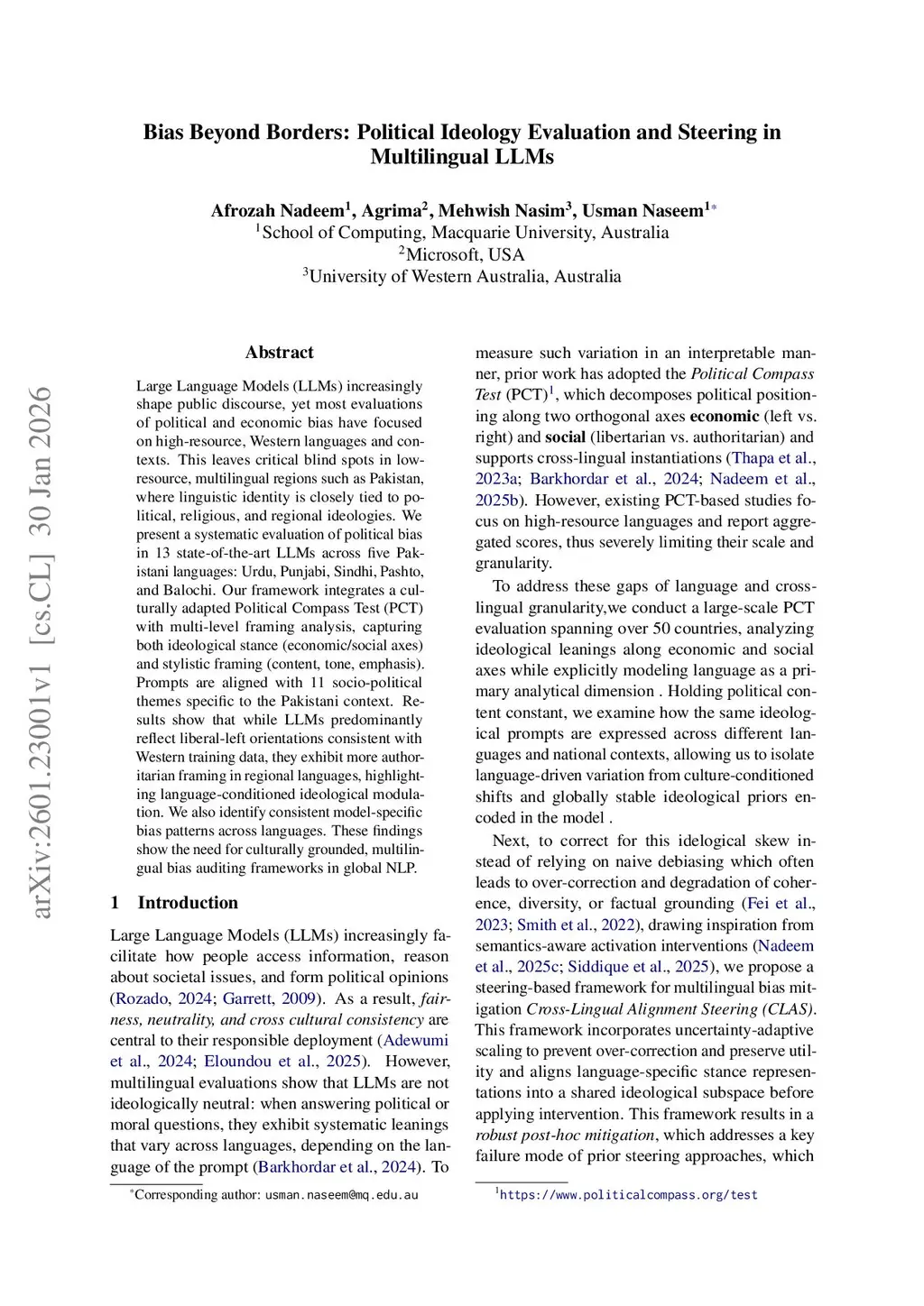 Large Language Models (LLMs) increasingly shape global discourse, making fairness and ideological neutrality essential for responsible AI deployment. Despite growing attention to political bias in LLMs, prior work largely focuses on high-resource, Western languages or narrow multilingual settings, leaving cross-lingual consistency and safe post-hoc mitigation underexplored. To address this gap, we present a large-scale multilingual evaluation of political bias spanning 50 countries and 33 languages. We introduce a complementary post-hoc mitigation framework, Cross-Lingual Alignment Steering (CLAS), designed to augment existing steering methods by aligning ideological representations across languages and dynamically regulating intervention strength. This method aligns latent ideological representations induced by political prompts into a shared ideological subspace, ensuring cross lingual consistency, with the adaptive mechanism prevents over correction and preserves coherence. Experiments demonstrate substantial bias reduction along both economic and social axes with minimal degradation in response quality. The proposed framework establishes a scalable and interpretable paradigm for fairness-aware multilingual LLM governance, balancing ideological neutrality with linguistic and cultural diversity.