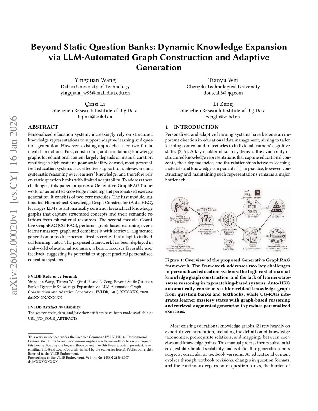 Personalized education systems increasingly rely on structured knowledge representations to support adaptive learning and question generation. However, existing approaches face two fundamental limitations. First, constructing and maintaining knowledge graphs for educational content largely depends on manual curation, resulting in high cost and poor scalability. Second, most personalized education systems lack effective support for state-aware and systematic reasoning over learners' knowledge, and therefore rely on static question banks with limited adaptability. To address these challenges, this paper proposes a Generative GraphRAG framework for automated knowledge modeling and personalized exercise generation. It consists of two core modules. The first module, Automated Hierarchical Knowledge Graph Constructor (Auto-HKG), leverages LLMs to automatically construct hierarchical knowledge graphs that capture structured concepts and their semantic relations from educational resources. The second module, Cognitive GraphRAG (CG-RAG), performs graph-based reasoning over a learner mastery graph and combines it with retrieval-augmented generation to produce personalized exercises that adapt to individual learning states. The proposed framework has been deployed in real-world educational scenarios, where it receives favorable user feedback, suggesting its potential to support practical personalized education systems.