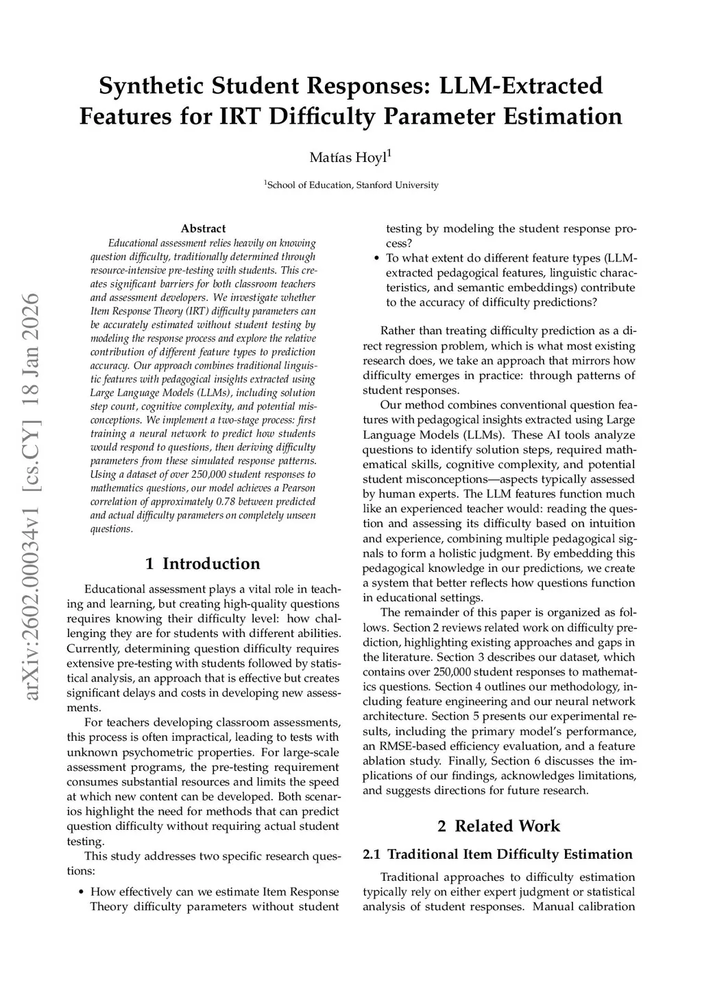 Synthetic Student Responses: LLM-Extracted Features for IRT Difficulty Parameter Estimation