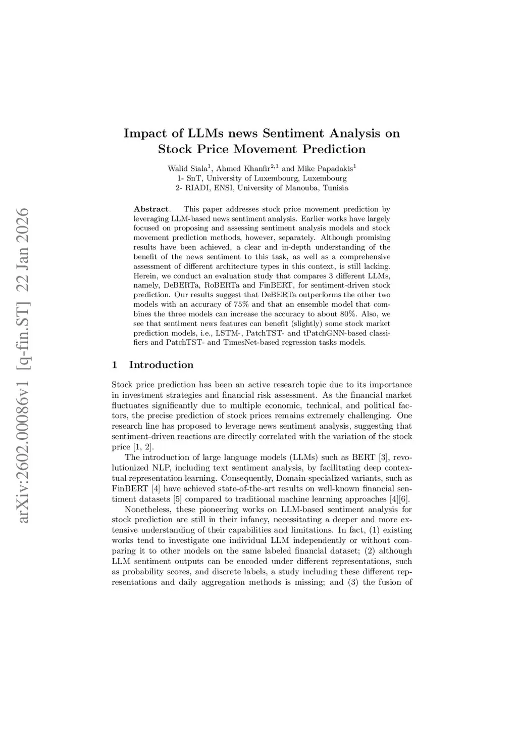 This paper addresses stock price movement prediction by leveraging LLM-based news sentiment analysis. Earlier works have largely focused on proposing and assessing sentiment analysis models and stock movement prediction methods, however, separately. Although promising results have been achieved, a clear and in-depth understanding of the benefit of the news sentiment to this task, as well as a comprehensive assessment of different architecture types in this context, is still lacking. Herein, we conduct an evaluation study that compares 3 different LLMs, namely, DeBERTa, RoBERTa and FinBERT, for sentiment-driven stock prediction. Our results suggest that DeBERTa outperforms the other two models with an accuracy of 75% and that an ensemble model that combines the three models can increase the accuracy to about 80%. Also, we see that sentiment news features can benefit (slightly) some stock market prediction models, i.e., LSTM-, PatchTST- and tPatchGNN-based classifiers and PatchTST- and TimesNet-based regression tasks models.