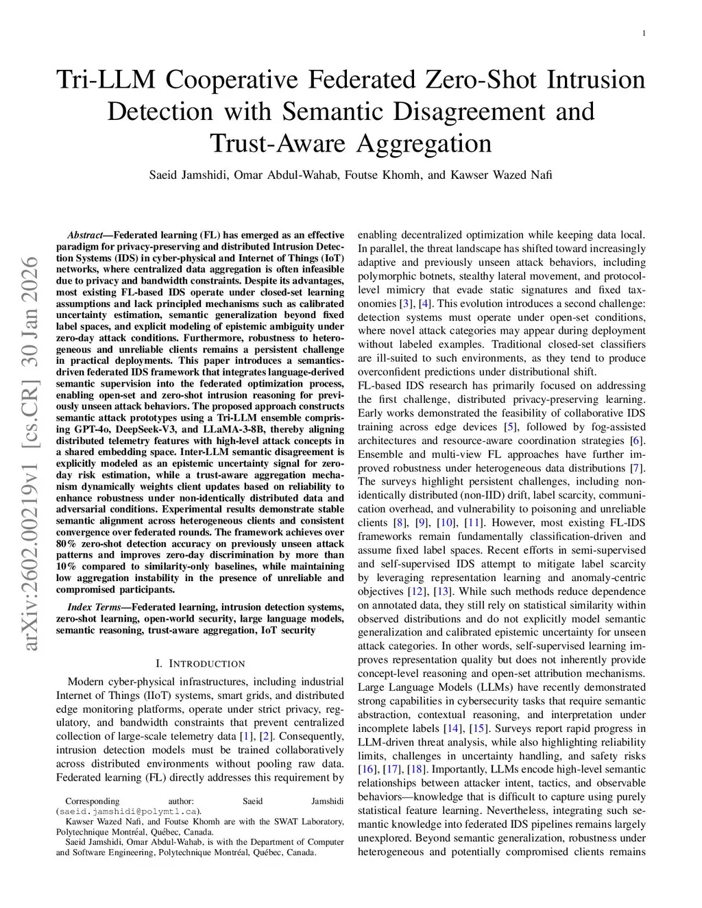 Federated learning (FL) has become an effective paradigm for privacy-preserving, distributed Intrusion Detection Systems (IDS) in cyber-physical and Internet of Things (IoT) networks, where centralized data aggregation is often infeasible due to privacy and bandwidth constraints. Despite its advantages, most existing FL-based IDS assume closed-set learning and lack mechanisms such as uncertainty estimation, semantic generalization, and explicit modeling of epistemic ambiguity in zero-day attack scenarios. Additionally, robustness to heterogeneous and unreliable clients remains a challenge in practical applications. This paper introduces a semantics-driven federated IDS framework that incorporates language-derived semantic supervision into federated optimization, enabling open-set and zero-shot intrusion detection for previously unseen attack behaviors. The approach constructs semantic attack prototypes using a Tri-LLM ensemble of GPT-4o, DeepSeek-V3, and LLaMA-3-8B, aligning distributed telemetry features with high-level attack concepts. Inter-LLM semantic disagreement is modeled as epistemic uncertainty for zero-day risk estimation, while a trust-aware aggregation mechanism dynamically weights client updates based on reliability. Experimental results show stable semantic alignment across heterogeneous clients and consistent convergence. The framework achieves over 80% zero-shot detection accuracy on unseen attack patterns, improving zero-day discrimination by more than 10% compared to similarity-based baselines, while maintaining low aggregation instability in the presence of unreliable or compromised clients.