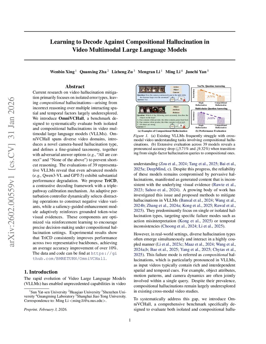 Current research on video hallucination mitigation primarily focuses on isolated error types, leaving compositional hallucinations, arising from incorrect reasoning over multiple interacting spatial and temporal factors largely underexplored. We introduce OmniVCHall, a benchmark designed to systematically evaluate both isolated and compositional hallucinations in video multimodal large language models (VLLMs). OmniVCHall spans diverse video domains, introduces a novel camera-based hallucination type, and defines a fine-grained taxonomy, together with adversarial answer options (e.g., "All are correct" and "None of the above") to prevent shortcut reasoning. The evaluations of 39 representative VLLMs reveal that even advanced models (e.g., Qwen3-VL and GPT-5) exhibit substantial performance degradation. We propose TriCD, a contrastive decoding framework with a triple-pathway calibration mechanism. An adaptive perturbation controller dynamically selects distracting operations to construct negative video variants, while a saliency-guided enhancement module adaptively reinforces grounded token-wise visual evidences. These components are optimized via reinforcement learning to encourage precise decision-making under compositional hallucination settings. Experimental results show that TriCD consistently improves performance across two representative backbones, achieving an average accuracy improvement of over 10%. The data and code can be find atthis https URL.