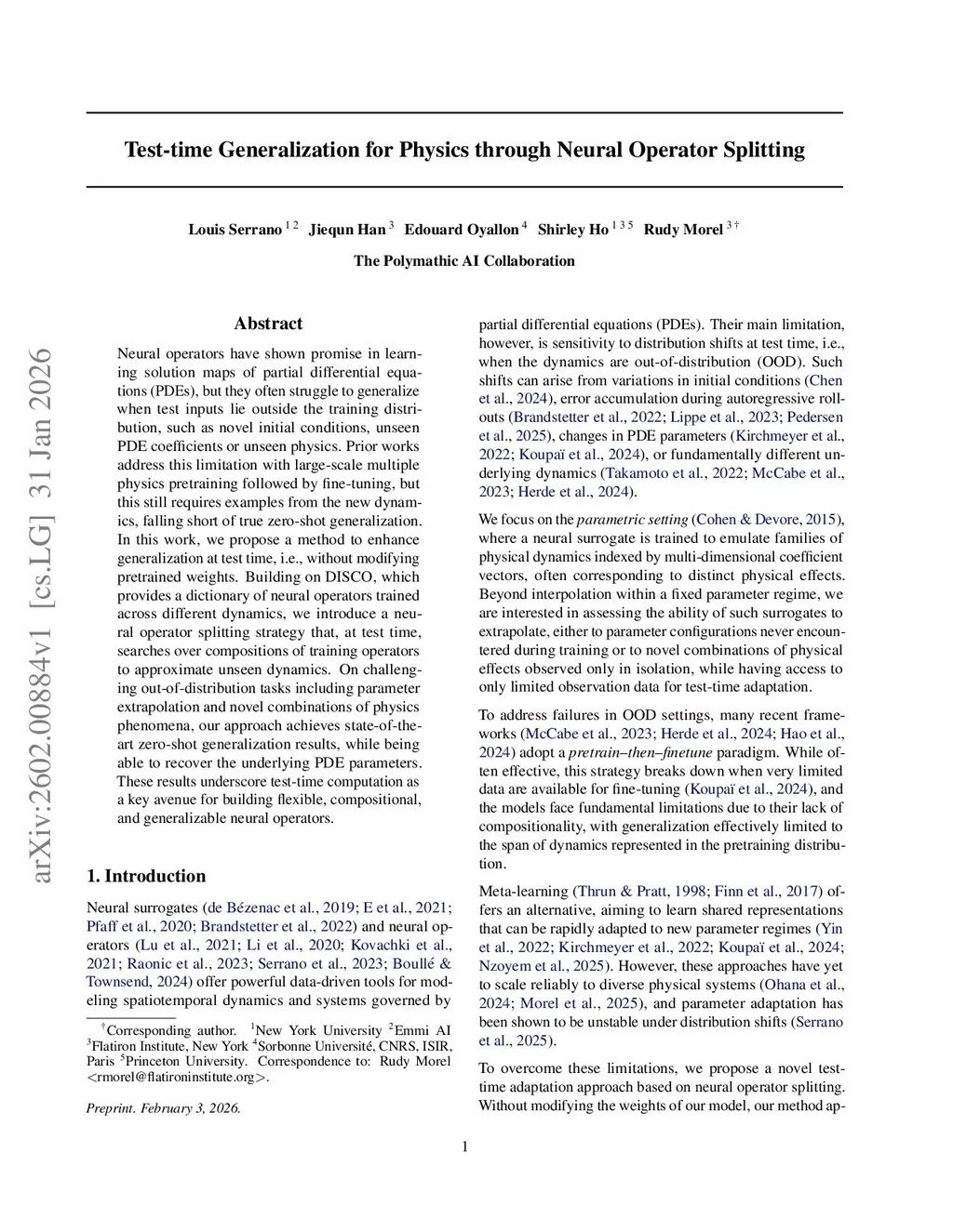 Neural operators have shown promise in learning solution maps of partial differential equations (PDEs), but they often struggle to generalize when test inputs lie outside the training distribution, such as novel initial conditions, unseen PDE coefficients or unseen physics. Prior works address this limitation with large-scale multiple physics pretraining followed by fine-tuning, but this still requires examples from the new dynamics, falling short of true zero-shot generalization. In this work, we propose a method to enhance generalization at test time, i.e., without modifying pretrained weights. Building on DISCO, which provides a dictionary of neural operators trained across different dynamics, we introduce a neural operator splitting strategy that, at test time, searches over compositions of training operators to approximate unseen dynamics. On challenging out-of-distribution tasks including parameter extrapolation and novel combinations of physics phenomena, our approach achieves state-of-the-art zero-shot generalization results, while being able to recover the underlying PDE parameters. These results underscore test-time computation as a key avenue for building flexible, compositional, and generalizable neural operators.