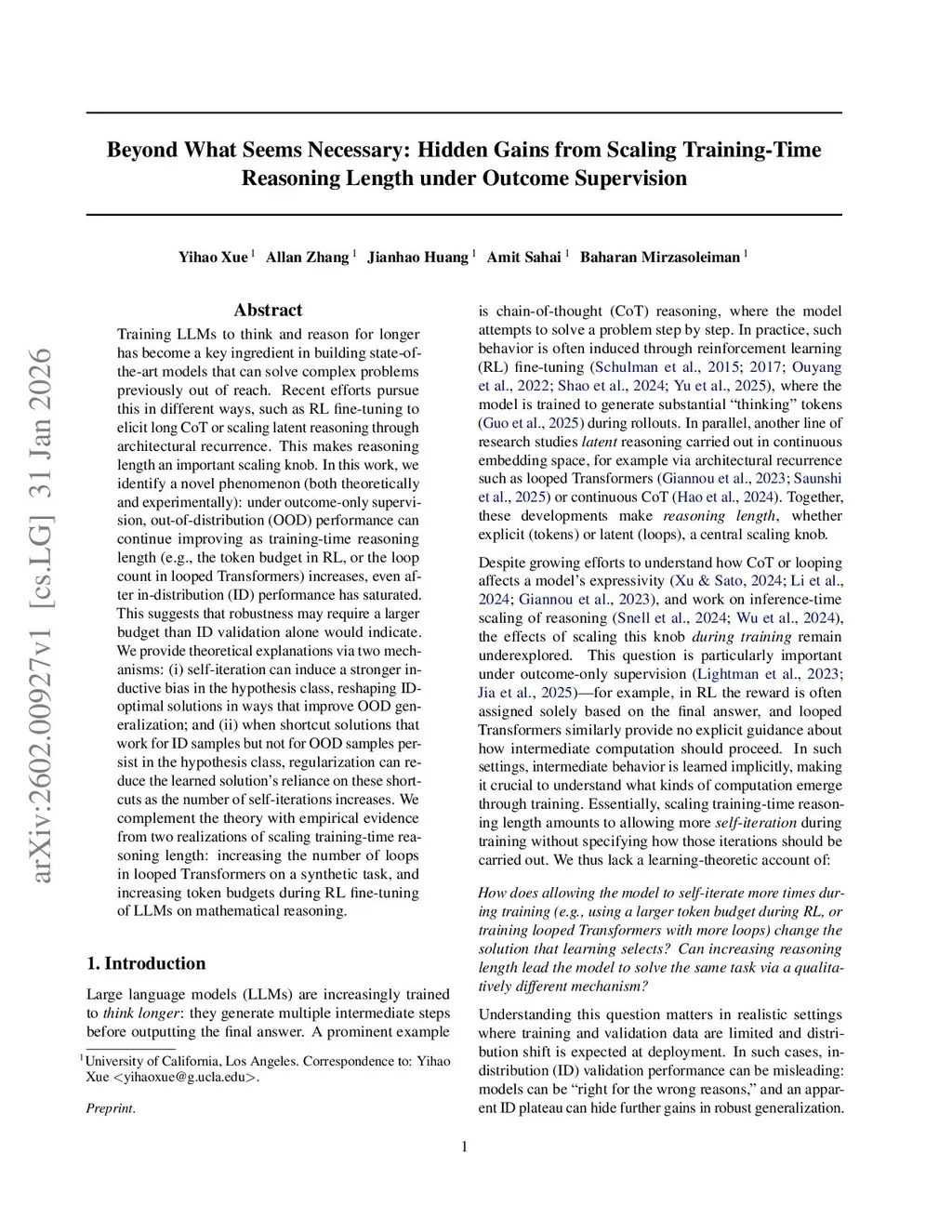 Training LLMs to think and reason for longer has become a key ingredient in building state-of-the-art models that can solve complex problems previously out of reach. Recent efforts pursue this in different ways, such as RL fine-tuning to elicit long CoT or scaling latent reasoning through architectural recurrence. This makes reasoning length an important scaling knob. In this work, we identify a novel phenomenon (both theoretically and experimentally): under outcome-only supervision, out-of-distribution (OOD) performance can continue improving as training-time reasoning length (e.g., the token budget in RL, or the loop count in looped Transformers) increases, even after in-distribution (ID) performance has saturated. This suggests that robustness may require a larger budget than ID validation alone would indicate. We provide theoretical explanations via two mechanisms: (i) self-iteration can induce a stronger inductive bias in the hypothesis class, reshaping ID-optimal solutions in ways that improve OOD generalization; and (ii) when shortcut solutions that work for ID samples but not for OOD samples persist in the hypothesis class, regularization can reduce the learned solution's reliance on these shortcuts as the number of self-iterations increases. We complement the theory with empirical evidence from two realizations of scaling training-time reasoning length: increasing the number of loops in looped Transformers on a synthetic task, and increasing token budgets during RL fine-tuning of LLMs on mathematical reasoning.