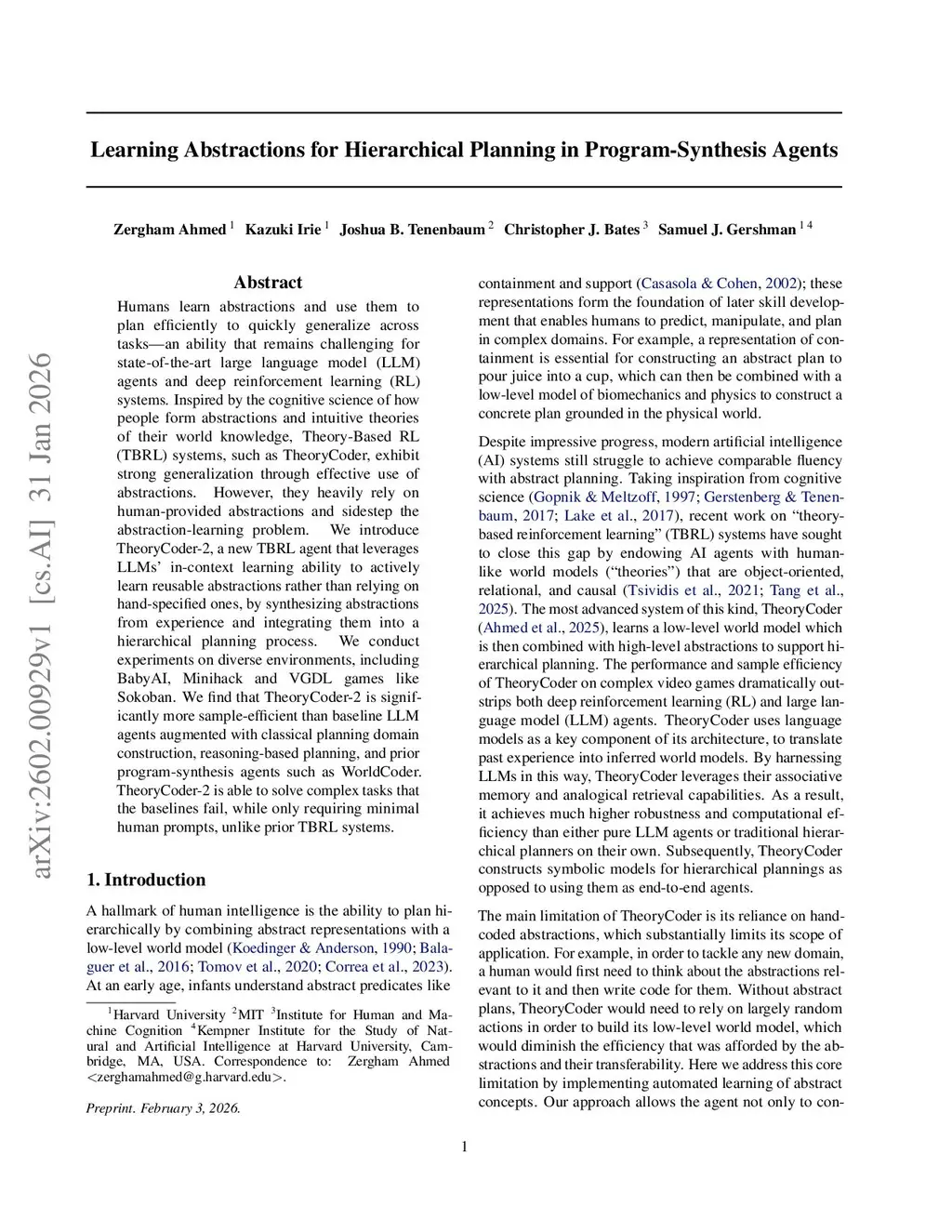Humans learn abstractions and use them to plan efficiently to quickly generalize across tasks -- an ability that remains challenging for state-of-the-art large language model (LLM) agents and deep reinforcement learning (RL) systems. Inspired by the cognitive science of how people form abstractions and intuitive theories of their world knowledge, Theory-Based RL (TBRL) systems, such as TheoryCoder, exhibit strong generalization through effective use of abstractions. However, they heavily rely on human-provided abstractions and sidestep the abstraction-learning problem. We introduce TheoryCoder-2, a new TBRL agent that leverages LLMs' in-context learning ability to actively learn reusable abstractions rather than relying on hand-specified ones, by synthesizing abstractions from experience and integrating them into a hierarchical planning process. We conduct experiments on diverse environments, including BabyAI, Minihack and VGDL games like Sokoban. We find that TheoryCoder-2 is significantly more sample-efficient than baseline LLM agents augmented with classical planning domain construction, reasoning-based planning, and prior program-synthesis agents such as WorldCoder. TheoryCoder-2 is able to solve complex tasks that the baselines fail, while only requiring minimal human prompts, unlike prior TBRL systems.