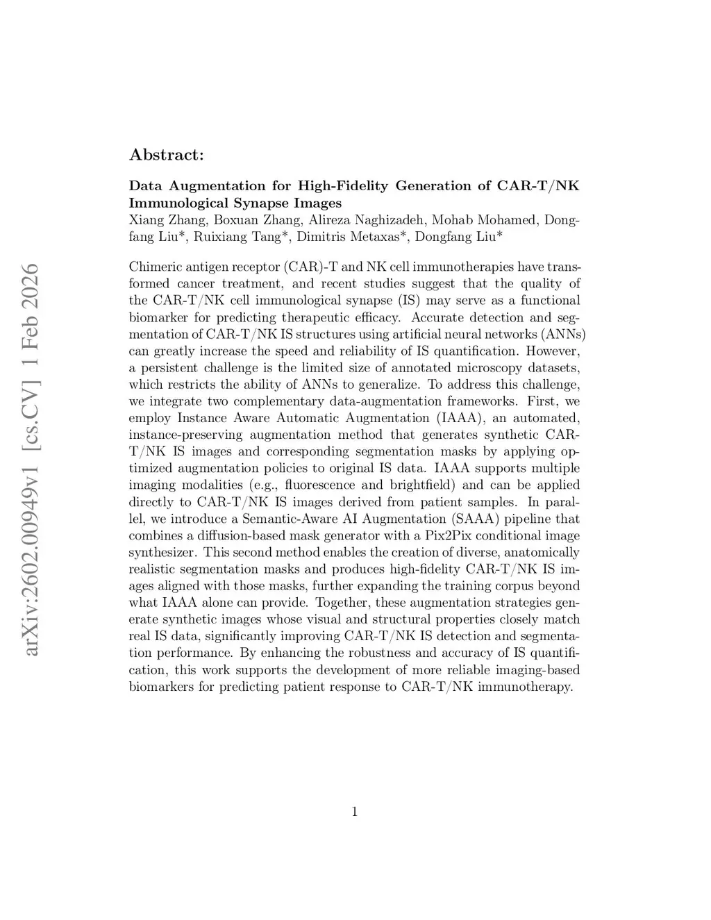 Chimeric antigen receptor (CAR)-T and NK cell immunotherapies have transformed cancer treatment, and recent studies suggest that the quality of the CAR-T/NK cell immunological synapse (IS) may serve as a functional biomarker for predicting therapeutic efficacy. Accurate detection and segmentation of CAR-T/NK IS structures using artificial neural networks (ANNs) can greatly increase the speed and reliability of IS quantification. However, a persistent challenge is the limited size of annotated microscopy datasets, which restricts the ability of ANNs to generalize. To address this challenge, we integrate two complementary data-augmentation frameworks. First, we employ Instance Aware Automatic Augmentation (IAAA), an automated, instance-preserving augmentation method that generates synthetic CAR-T/NK IS images and corresponding segmentation masks by applying optimized augmentation policies to original IS data. IAAA supports multiple imaging modalities (e.g., fluorescence and brightfield) and can be applied directly to CAR-T/NK IS images derived from patient samples. In parallel, we introduce a Semantic-Aware AI Augmentation (SAAA) pipeline that combines a diffusion-based mask generator with a Pix2Pix conditional image synthesizer. This second method enables the creation of diverse, anatomically realistic segmentation masks and produces high-fidelity CAR-T/NK IS images aligned with those masks, further expanding the training corpus beyond what IAAA alone can provide. Together, these augmentation strategies generate synthetic images whose visual and structural properties closely match real IS data, significantly improving CAR-T/NK IS detection and segmentation performance. By enhancing the robustness and accuracy of IS quantification, this work supports the development of more reliable imaging-based biomarkers for predicting patient response to CAR-T/NK immunotherapy.