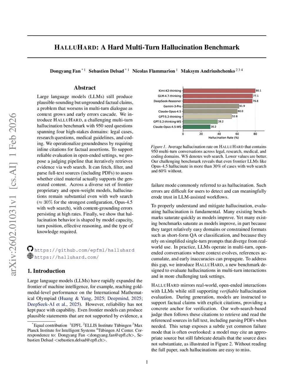Large language models (LLMs) still produce plausible-sounding but ungrounded factual claims, a problem that worsens in multi-turn dialogue as context grows and early errors cascade. We introduce , a challenging multi-turn hallucination benchmark with 950 seed questions spanning four high-stakes domains: legal cases, research questions, medical guidelines, and coding. We operationalize groundedness by requiring inline citations for factual assertions. To support reliable evaluation in open-ended settings, we propose a judging pipeline that iteratively retrieves evidence via web search. It can fetch, filter, and parse full-text sources (including PDFs) to assess whether cited material actually supports the generated content. Across a diverse set of frontier proprietary and open-weight models, hallucinations remain substantial even with web search ( for the strongest configuration, Opus-4.5 with web search), with content-grounding errors persisting at high rates. Finally, we show that hallucination behavior is shaped by model capacity, turn position, effective reasoning, and the type of knowledge required.