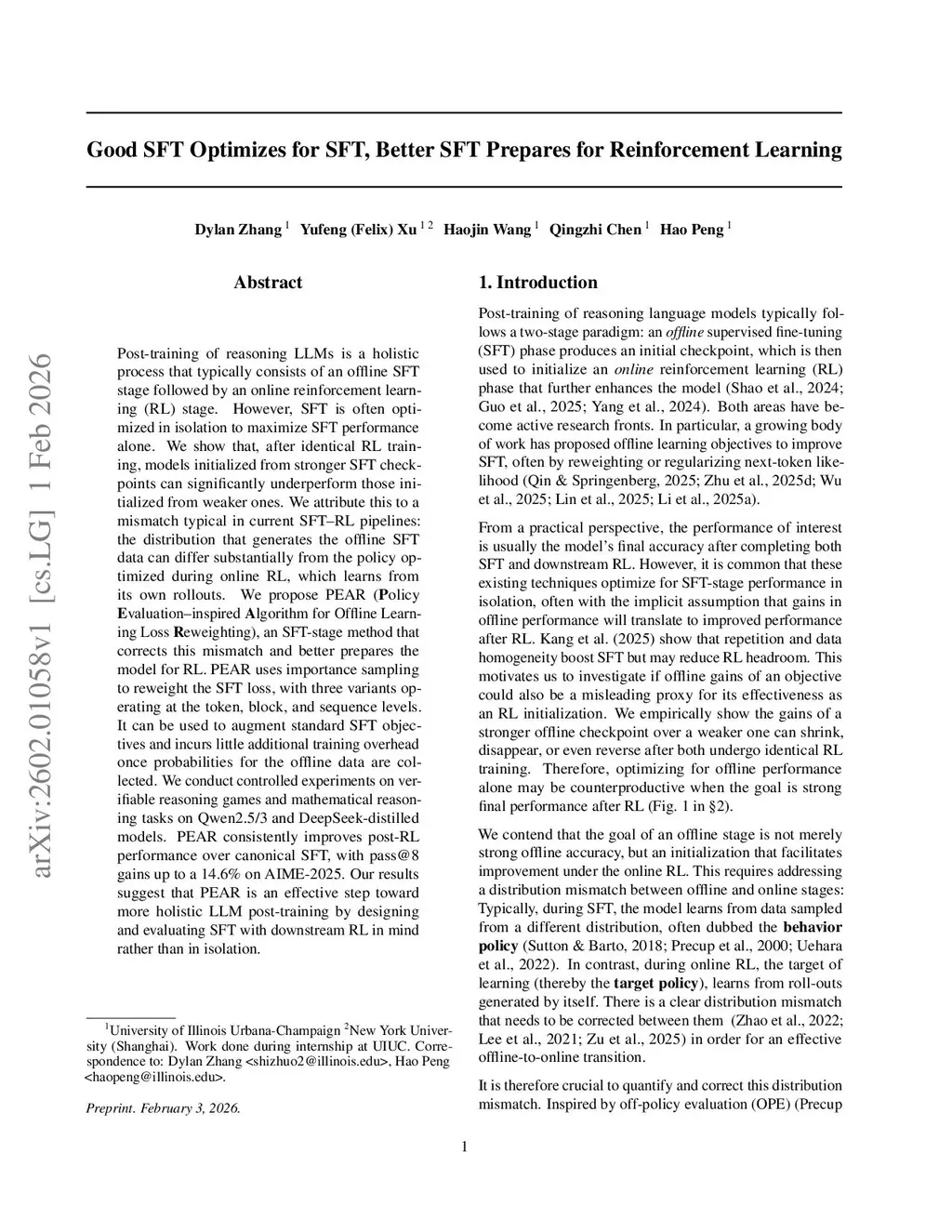 Post-training of reasoning LLMs is a holistic process that typically consists of an offline SFT stage followed by an online reinforcement learning (RL) stage. However, SFT is often optimized in isolation to maximize SFT performance alone.We show that, after identical RL training, models initialized from stronger SFT checkpoints can significantly underperform those initialized from weaker ones. We attribute this to a mismatch typical in current SFT-RL pipelines: the distribution that generates the offline SFT data can differ substantially from the policy optimized during online RL, which learns from its own rollouts.We propose PEAR (Policy Evaluation-inspired Algorithm for Offline Learning Loss Re-weighting), an SFT-stage method that corrects this mismatch and better prepares the model for RL. PEAR uses importance sampling to reweight the SFT loss, with three variants operating at the token, block, and sequence levels. It can be used to augment standard SFT objectives and incurs little additional training overhead once probabilities for the offline data are collected.We conduct controlled experiments on verifiable reasoning games and mathematical reasoning tasks on Qwen 2.5 and 3 and DeepSeek-distilled models. PEAR consistently improves post-RL performance over canonical SFT, with pass at 8 gains up to a 14.6 percent on AIME2025. Our results suggest that PEAR is an effective step toward more holistic LLM post-training by designing and evaluating SFT with downstream RL in mind rather than in isolation.