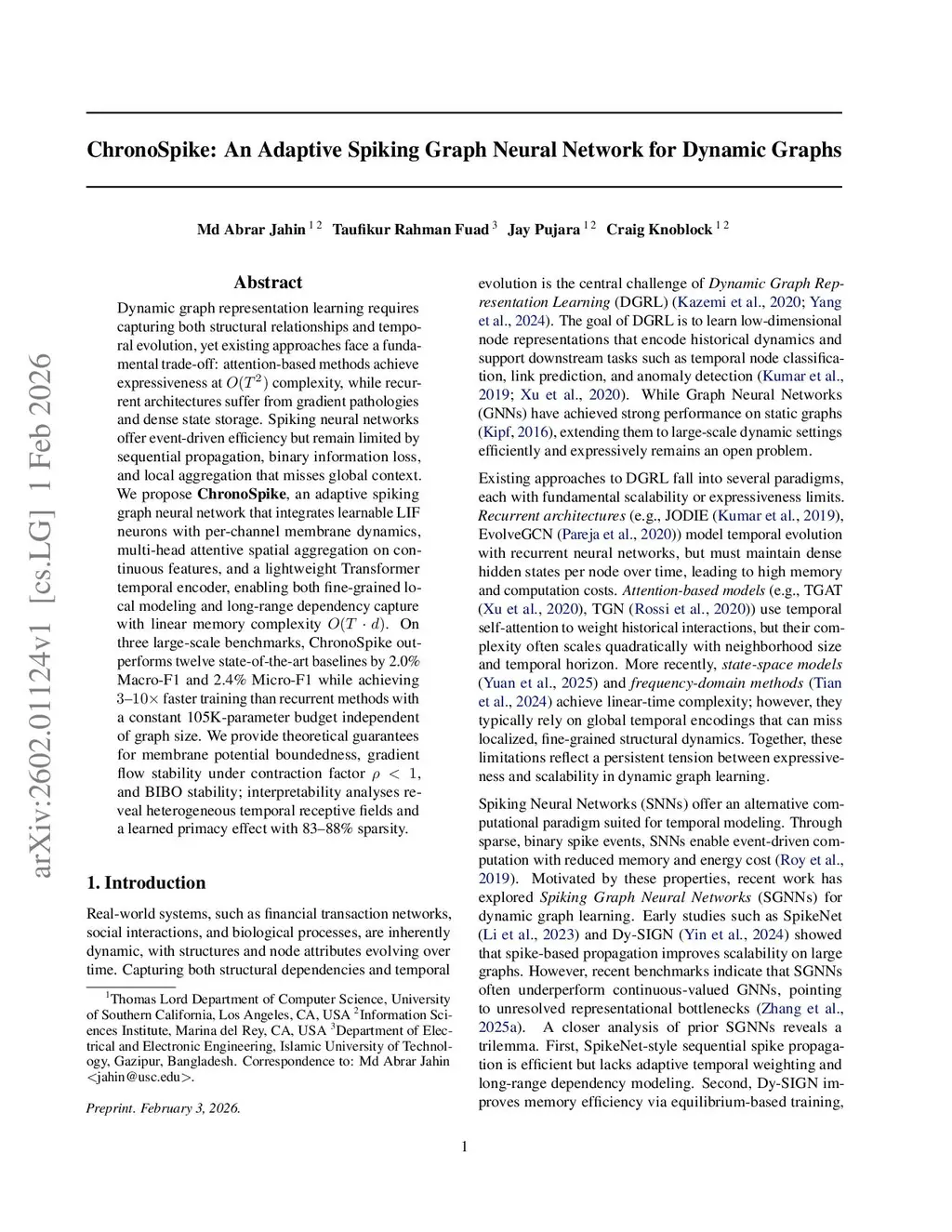 Dynamic graph representation learning requires capturing both structural relationships and temporal evolution, yet existing approaches face a fundamental trade-off: attention-based methods achieve expressiveness at complexity, while recurrent architectures suffer from gradient pathologies and dense state storage. Spiking neural networks offer event-driven efficiency but remain limited by sequential propagation, binary information loss, and local aggregation that misses global context. We propose ChronoSpike, an adaptive spiking graph neural network that integrates learnable LIF neurons with per-channel membrane dynamics, multi-head attentive spatial aggregation on continuous features, and a lightweight Transformer temporal encoder, enabling both fine-grained local modeling and long-range dependency capture with linear memory complexity . On three large-scale benchmarks, ChronoSpike outperforms twelve state-of-the-art baselines by Macro-F1 and Micro-F1 while achieving faster training than recurrent methods with a constant 105K-parameter budget independent of graph size. We provide theoretical guarantees for membrane potential boundedness, gradient flow stability under contraction factor , and BIBO stability; interpretability analyses reveal heterogeneous temporal receptive fields and a learned primacy effect with sparsity.