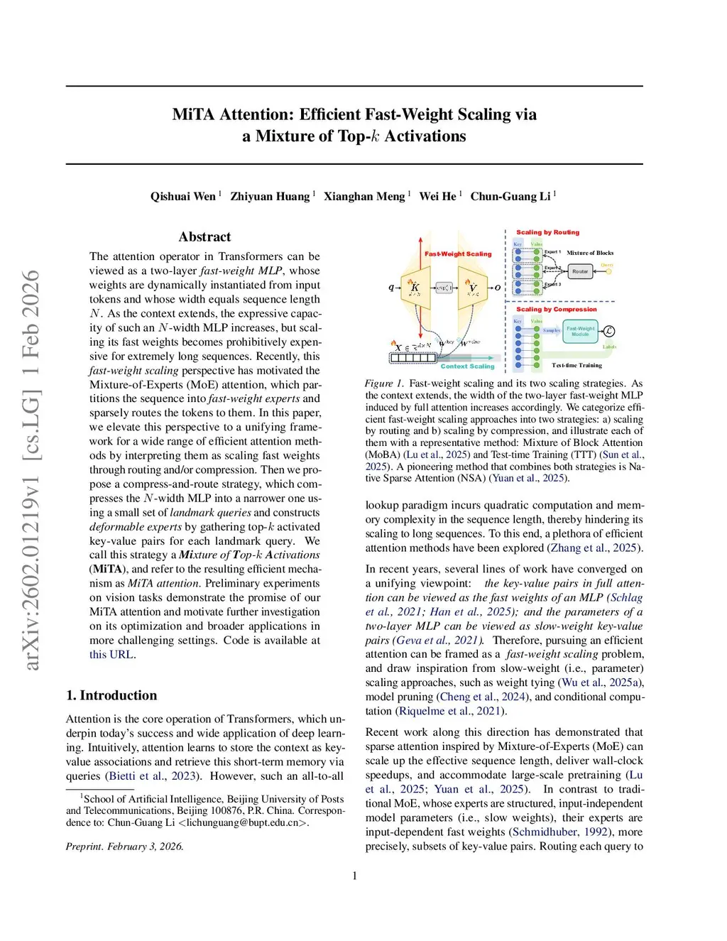 The attention operator in Transformers can be viewed as a two-layer fast-weight MLP, whose weights are dynamically instantiated from input tokens and whose width equals sequence length N. As the context extends, the expressive capacity of such an N-width MLP increases, but scaling its fast weights becomes prohibitively expensive for extremely long sequences. Recently, this fast-weight scaling perspective has motivated the Mixture-of-Experts (MoE) attention, which partitions the sequence into fast-weight experts and sparsely routes the tokens to them. In this paper, we elevate this perspective to a unifying framework for a wide range of efficient attention methods by interpreting them as scaling fast weights through either routing or compression. Then we propose a compress-and-route strategy, which compresses the N-width MLP into a narrower one using a small set of landmark queries and constructs deformable experts by gathering top-k activated key-value pairs for each landmark query. We call this strategy a Mixture of Top-k Activations (MiTA), and refer to the resulting efficient mechanism as MiTA attention. Preliminary experiments on vision tasks demonstrate the promise of our MiTA attention and motivate further investigation on its optimization and broader applications in more challenging settings.