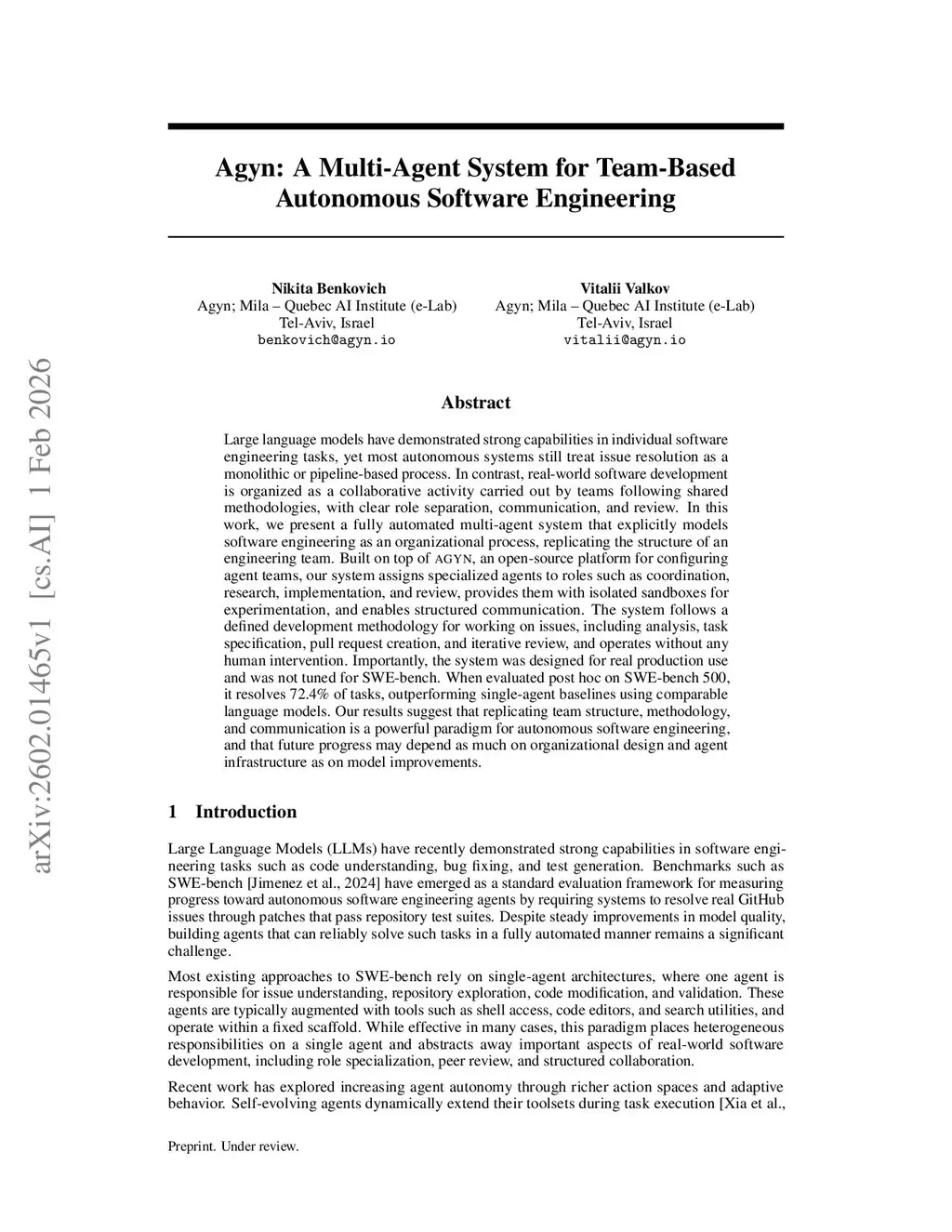 Large language models have demonstrated strong capabilities in individual software engineering tasks, yet most autonomous systems still treat issue resolution as a monolithic or pipeline-based process. In contrast, real-world software development is organized as a collaborative activity carried out by teams following shared methodologies, with clear role separation, communication, and review. In this work, we present a fully automated multi-agent system that explicitly models software engineering as an organizational process, replicating the structure of an engineering team. Built on top of agyn, an open-source platform for configuring agent teams, our system assigns specialized agents to roles such as coordination, research, implementation, and review, provides them with isolated sandboxes for experimentation, and enables structured communication. The system follows a defined development methodology for working on issues, including analysis, task specification, pull request creation, and iterative review, and operates without any human intervention. Importantly, the system was designed for real production use and was not tuned for SWE-bench. When evaluated post hoc on SWE-bench 500, it resolves 72.4% of tasks, outperforming single-agent baselines using comparable language models. Our results suggest that replicating team structure, methodology, and communication is a powerful paradigm for autonomous software engineering, and that future progress may depend as much on organizational design and agent infrastructure as on model improvements.