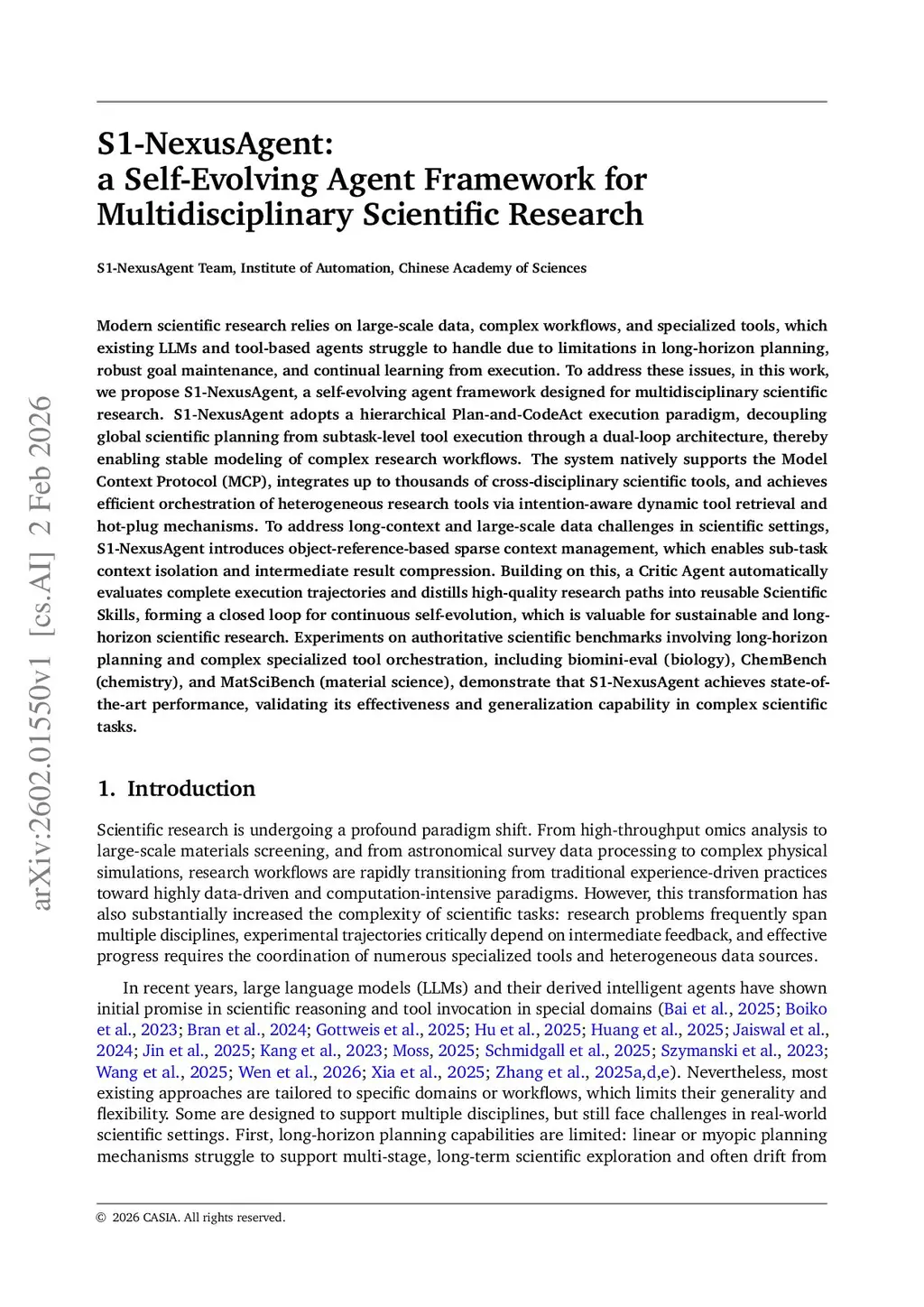 Modern scientific research relies on large-scale data, complex workflows, and specialized tools, which existing LLMs and tool-based agents struggle to handle due to limitations in long-horizon planning, robust goal maintenance, and continual learning from execution. To address these issues, in this work, we propose S1-NexusAgent, a self-evolving agent framework designed for multidisciplinary scientific research. S1-NexusAgent adopts a hierarchical Plan-and-CodeAct execution paradigm, decoupling global scientific planning from subtask-level tool execution through a dual-loop architecture, thereby enabling stable modeling of complex research workflows. The system natively supports the Model Context Protocol (MCP), integrates up to thousands of cross-disciplinary scientific tools, and achieves efficient orchestration of heterogeneous research tools via intention-aware dynamic tool retrieval and hot-plug mechanisms. To address long-context and large-scale data challenges in scientific settings, S1-NexusAgent introduces object-reference-based sparse context management, which enables sub-task context isolation and intermediate result compression. Building on this, a Critic Agent automatically evaluates complete execution trajectories and distills high-quality research paths into reusable Scientific Skills, forming a closed loop for continuous self-evolution, which is valuable for sustainable and long-horizon scientific research. Experiments on authoritative scientific benchmarks involving long-horizon planning and complex specialized tool orchestration, including biomini-eval (biology), ChemBench (chemistry), and MatSciBench (material science), demonstrate that S1-NexusAgent achieves state-of-the-art performance, validating its effectiveness and generalization capability in complex scientific tasks.