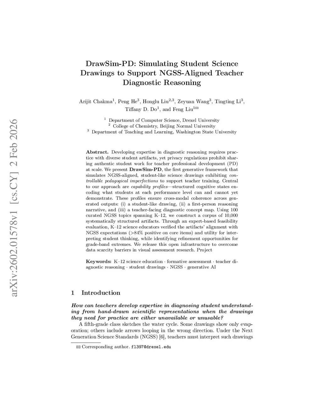 Developing expertise in diagnostic reasoning requires practice with diverse student artifacts, yet privacy regulations prohibit sharing authentic student work for teacher professional development (PD) at scale. We present DrawSim-PD, the first generative framework that simulates NGSS-aligned, student-like science drawings exhibiting controllable pedagogical imperfections to support teacher training. Central to our approach are apability profiles--structured cognitive states encoding what students at each performance level can and cannot yet demonstrate. These profiles ensure cross-modal coherence across generated outputs: (i) a student-like drawing, (ii) a first-person reasoning narrative, and (iii) a teacher-facing diagnostic concept map. Using 100 curated NGSS topics spanning K-12, we construct a corpus of 10,000 systematically structured artifacts. Through an expert-based feasibility evaluation, K--12 science educators verified the artifacts' alignment with NGSS expectations (>84% positive on core items) and utility for interpreting student thinking, while identifying refinement opportunities for grade-band extremes. We release this open infrastructure to overcome data scarcity barriers in visual assessment research.