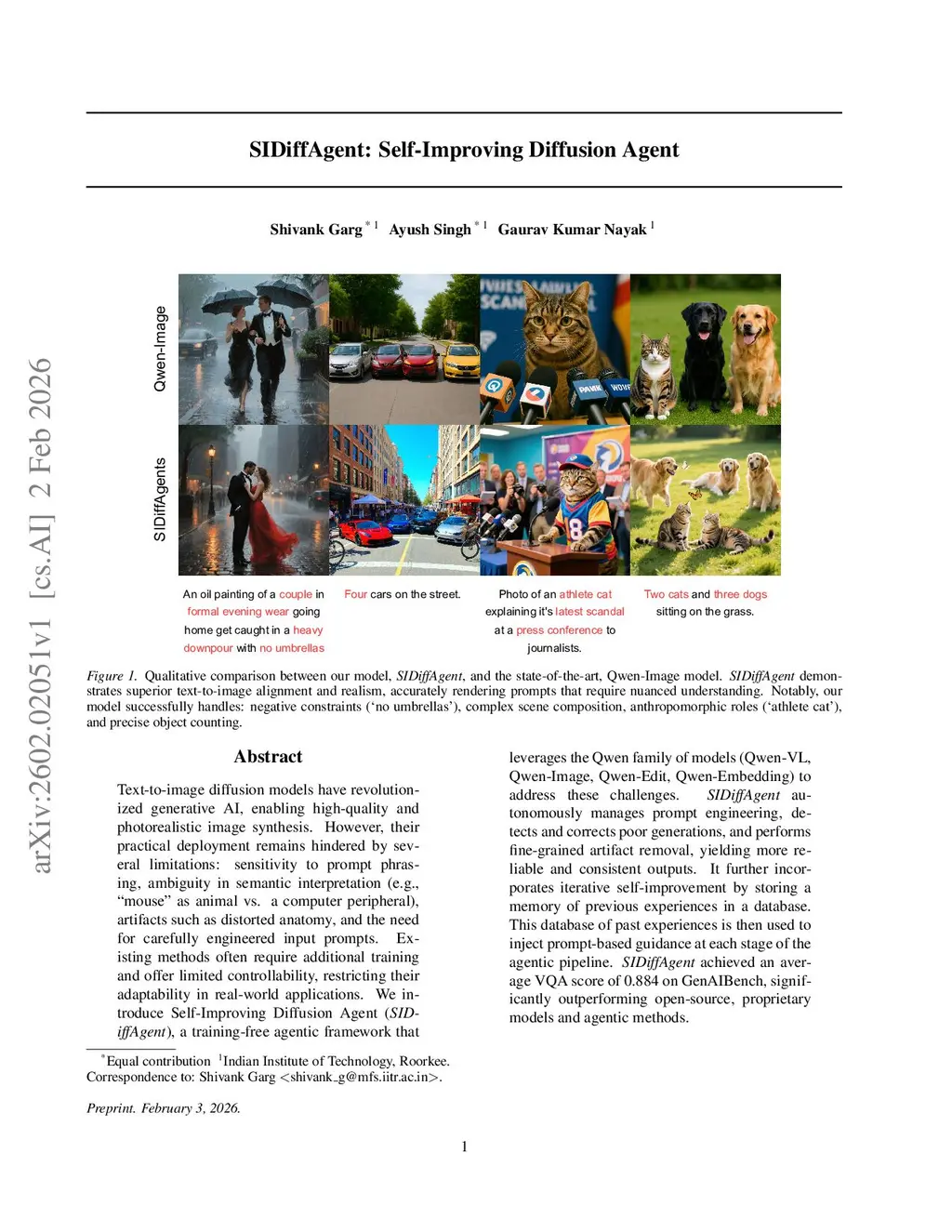 Text-to-image diffusion models have revolutionized generative AI, enabling high-quality and photorealistic image synthesis. However, their practical deployment remains hindered by several limitations: sensitivity to prompt phrasing, ambiguity in semantic interpretation (e.g., ``mouse" as animal vs. a computer peripheral), artifacts such as distorted anatomy, and the need for carefully engineered input prompts. Existing methods often require additional training and offer limited controllability, restricting their adaptability in real-world applications. We introduce Self-Improving Diffusion Agent (SIDiffAgent), a training-free agentic framework that leverages the Qwen family of models (Qwen-VL, Qwen-Image, Qwen-Edit, Qwen-Embedding) to address these challenges. SIDiffAgent autonomously manages prompt engineering, detects and corrects poor generations, and performs fine-grained artifact removal, yielding more reliable and consistent outputs. It further incorporates iterative self-improvement by storing a memory of previous experiences in a database. This database of past experiences is then used to inject prompt-based guidance at each stage of the agentic pipeline. \modelour achieved an average VQA score of 0.884 on GenAIBench, significantly outperforming open-source, proprietary models and agentic methods. We will publicly release our code upon acceptance.