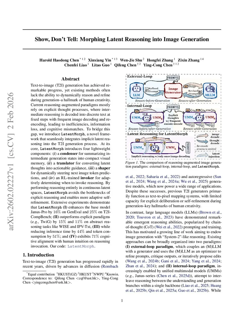 Text-to-image (T2I) generation has achieved remarkable progress, yet existing methods often lack the ability to dynamically reason and refine during generation--a hallmark of human creativity. Current reasoning-augmented paradigms most rely on explicit thought processes, where intermediate reasoning is decoded into discrete text at fixed steps with frequent image decoding and re-encoding, leading to inefficiencies, information loss, and cognitive mismatches. To bridge this gap, we introduce LatentMorph, a novel framework that seamlessly integrates implicit latent reasoning into the T2I generation process. At its core, LatentMorph introduces four lightweight components: (i) a condenser for summarizing intermediate generation states into compact visual memory, (ii) a translator for converting latent thoughts into actionable guidance, (iii) a shaper for dynamically steering next image token predictions, and (iv) an RL-trained invoker for adaptively determining when to invoke reasoning. By performing reasoning entirely in continuous latent spaces, LatentMorph avoids the bottlenecks of explicit reasoning and enables more adaptive self-refinement. Extensive experiments demonstrate that LatentMorph (I) enhances the base model Janus-Pro by on GenEval and on T2I-CompBench; (II) outperforms explicit paradigms (e.g., TwiG) by and on abstract reasoning tasks like WISE and IPV-Txt, (III) while reducing inference time by and token consumption by ; and (IV) exhibits cognitive alignment with human intuition on reasoning invocation.