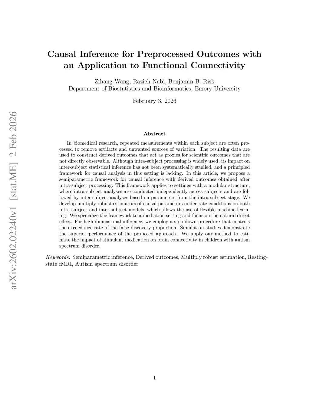 In biomedical research, repeated measurements within each subject are often processed to remove artifacts and unwanted sources of variation. The resulting data are used to construct derived outcomes that act as proxies for scientific outcomes that are not directly observable. Although intra-subject processing is widely used, its impact on inter-subject statistical inference has not been systematically studied, and a principled framework for causal analysis in this setting is lacking. In this article, we propose a semiparametric framework for causal inference with derived outcomes obtained after intra-subject processing. This framework applies to settings with a modular structure, where intra-subject analyses are conducted independently across subjects and are followed by inter-subject analyses based on parameters from the intra-subject stage. We develop multiply robust estimators of causal parameters under rate conditions on both intra-subject and inter-subject models, which allows the use of flexible machine learning. We specialize the framework to a mediation setting and focus on the natural direct effect. For high dimensional inference, we employ a step-down procedure that controls the exceedance rate of the false discovery proportion. Simulation studies demonstrate the superior performance of the proposed approach. We apply our method to estimate the impact of stimulant medication on brain connectivity in children with autism spectrum disorder.
