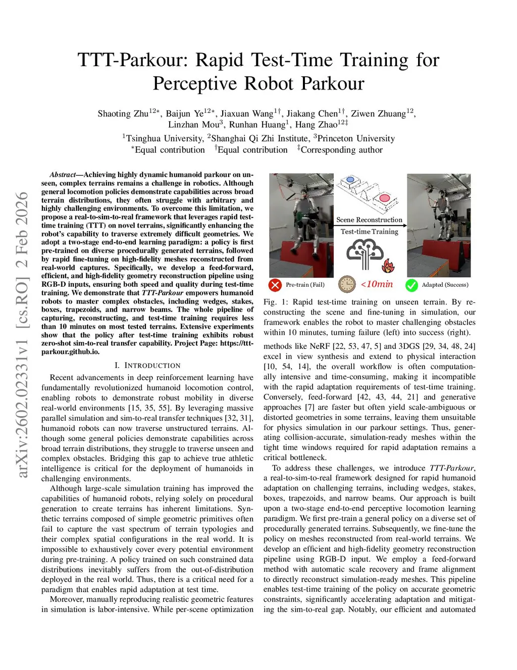 Achieving highly dynamic humanoid parkour on unseen, complex terrains remains a challenge in robotics. Although general locomotion policies demonstrate capabilities across broad terrain distributions, they often struggle with arbitrary and highly challenging environments. To overcome this limitation, we propose a real-to-sim-to-real framework that leverages rapid test-time training (TTT) on novel terrains, significantly enhancing the robot's capability to traverse extremely difficult geometries. We adopt a two-stage end-to-end learning paradigm: a policy is first pre-trained on diverse procedurally generated terrains, followed by rapid fine-tuning on high-fidelity meshes reconstructed from real-world captures. Specifically, we develop a feed-forward, efficient, and high-fidelity geometry reconstruction pipeline using RGB-D inputs, ensuring both speed and quality during test-time training. We demonstrate that TTT-Parkour empowers humanoid robots to master complex obstacles, including wedges, stakes, boxes, trapezoids, and narrow beams. The whole pipeline of capturing, reconstructing, and test-time training requires less than 10 minutes on most tested terrains. Extensive experiments show that the policy after test-time training exhibits robust zero-shot sim-to-real transfer capability.