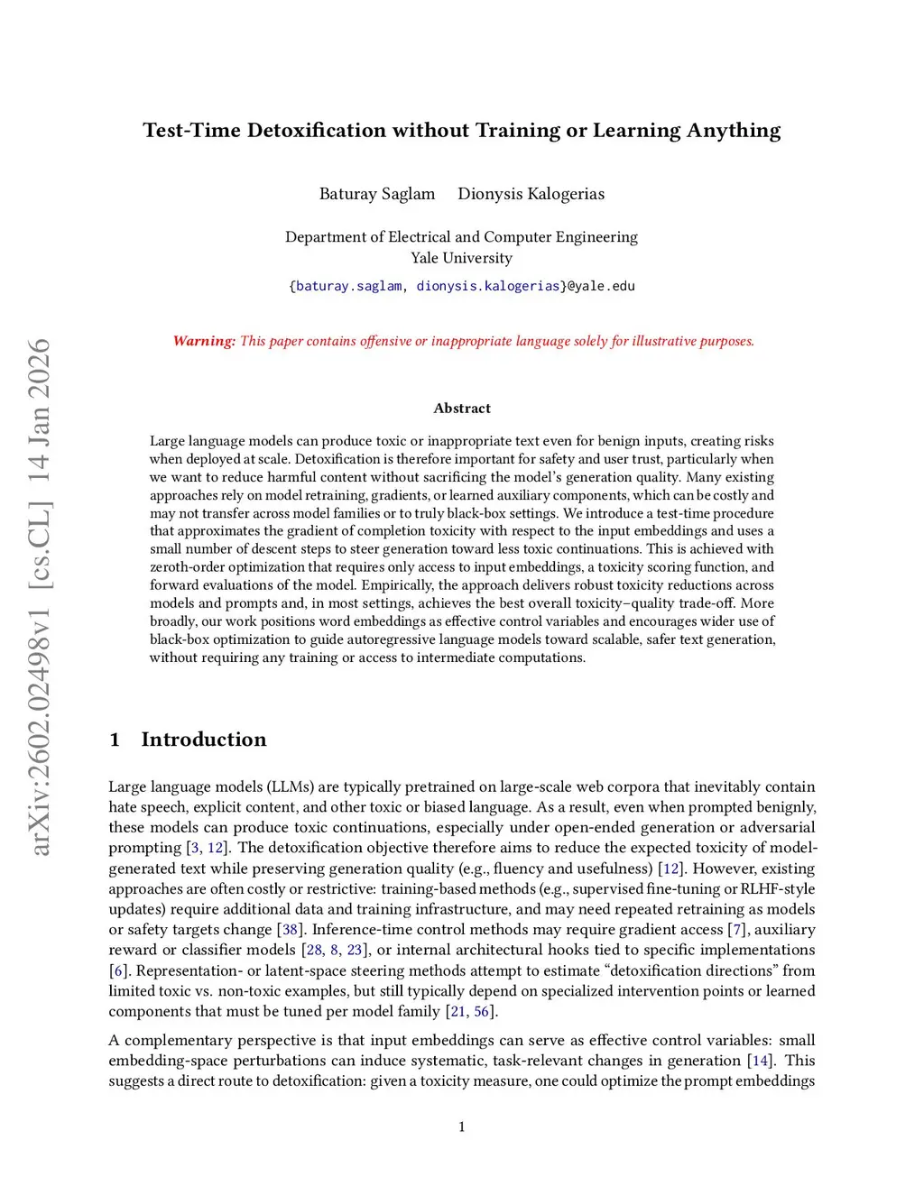 Large language models can produce toxic or inappropriate text even for benign inputs, creating risks when deployed at scale. Detoxification is therefore important for safety and user trust, particularly when we want to reduce harmful content without sacrificing the model's generation quality. Many existing approaches rely on model retraining, gradients, or learned auxiliary components, which can be costly and may not transfer across model families or to truly black-box settings. We introduce a test-time procedure that approximates the gradient of completion toxicity with respect to the input embeddings and uses a small number of descent steps to steer generation toward less toxic continuations. This is achieved with zeroth-order optimization that requires only access to input embeddings, a toxicity scoring function, and forward evaluations of the model. Empirically, the approach delivers robust toxicity reductions across models and prompts and, in most settings, achieves the best overall toxicity-quality trade-off. More broadly, our work positions word embeddings as effective control variables and encourages wider use of black-box optimization to guide autoregressive language models toward scalable, safer text generation, without requiring any training or access to intermediate computations.
