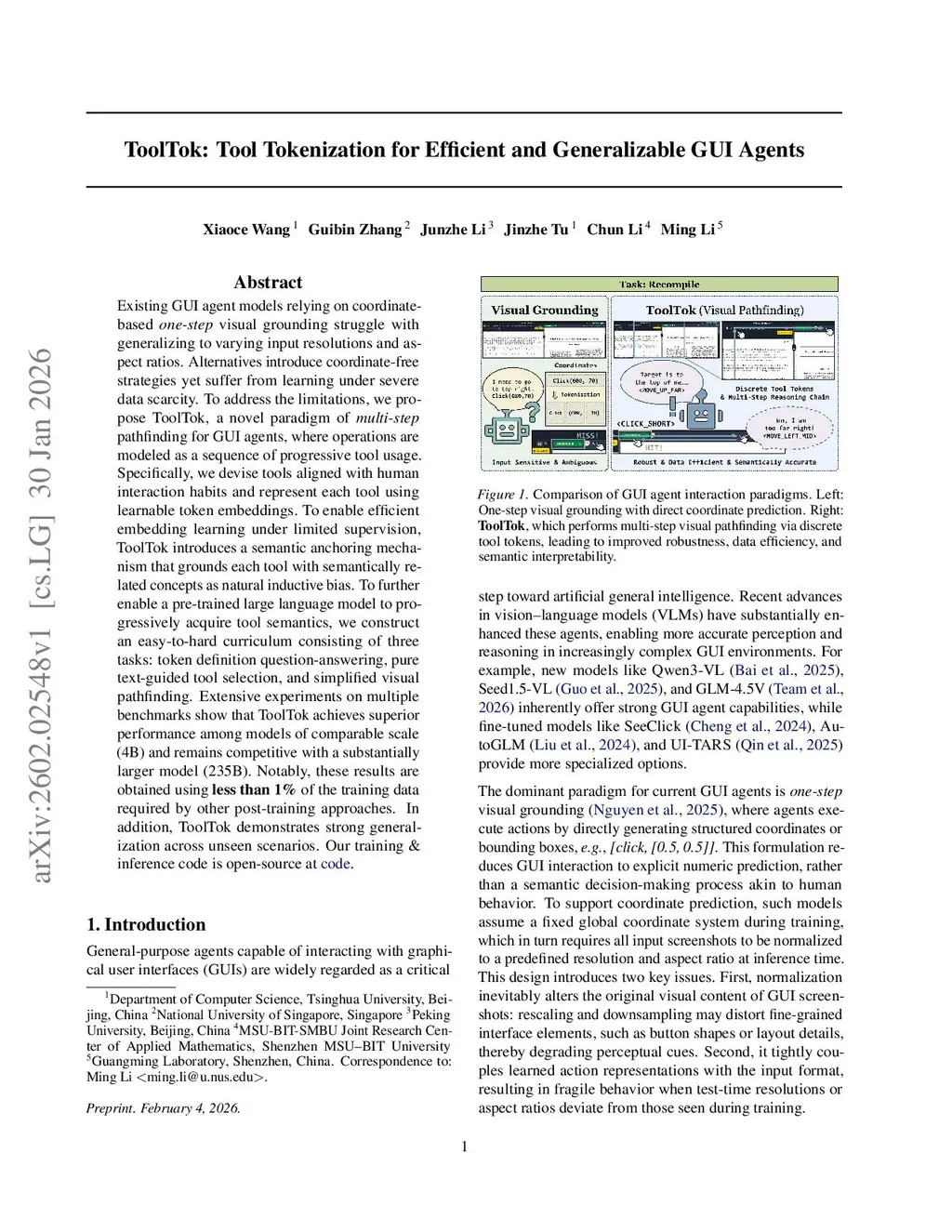 Existing GUI agent models relying on coordinate-based one-step visual grounding struggle with generalizing to varying input resolutions and aspect ratios. Alternatives introduce coordinate-free strategies yet suffer from learning under severe data scarcity. To address the limitations, we propose ToolTok, a novel paradigm of multi-step pathfinding for GUI agents, where operations are modeled as a sequence of progressive tool usage. Specifically, we devise tools aligned with human interaction habits and represent each tool using learnable token embeddings. To enable efficient embedding learning under limited supervision, ToolTok introduces a semantic anchoring mechanism that grounds each tool with semantically related concepts as natural inductive bias. To further enable a pre-trained large language model to progressively acquire tool semantics, we construct an easy-to-hard curriculum consisting of three tasks: token definition question-answering, pure text-guided tool selection, and simplified visual pathfinding. Extensive experiments on multiple benchmarks show that ToolTok achieves superior performance among models of comparable scale (4B) and remains competitive with a substantially larger model (235B). Notably, these results are obtained using less than 1% of the training data required by other post-training approaches. In addition, ToolTok demonstrates strong generalization across unseen scenarios. Our training & inference code is open-source atthis https URL.
