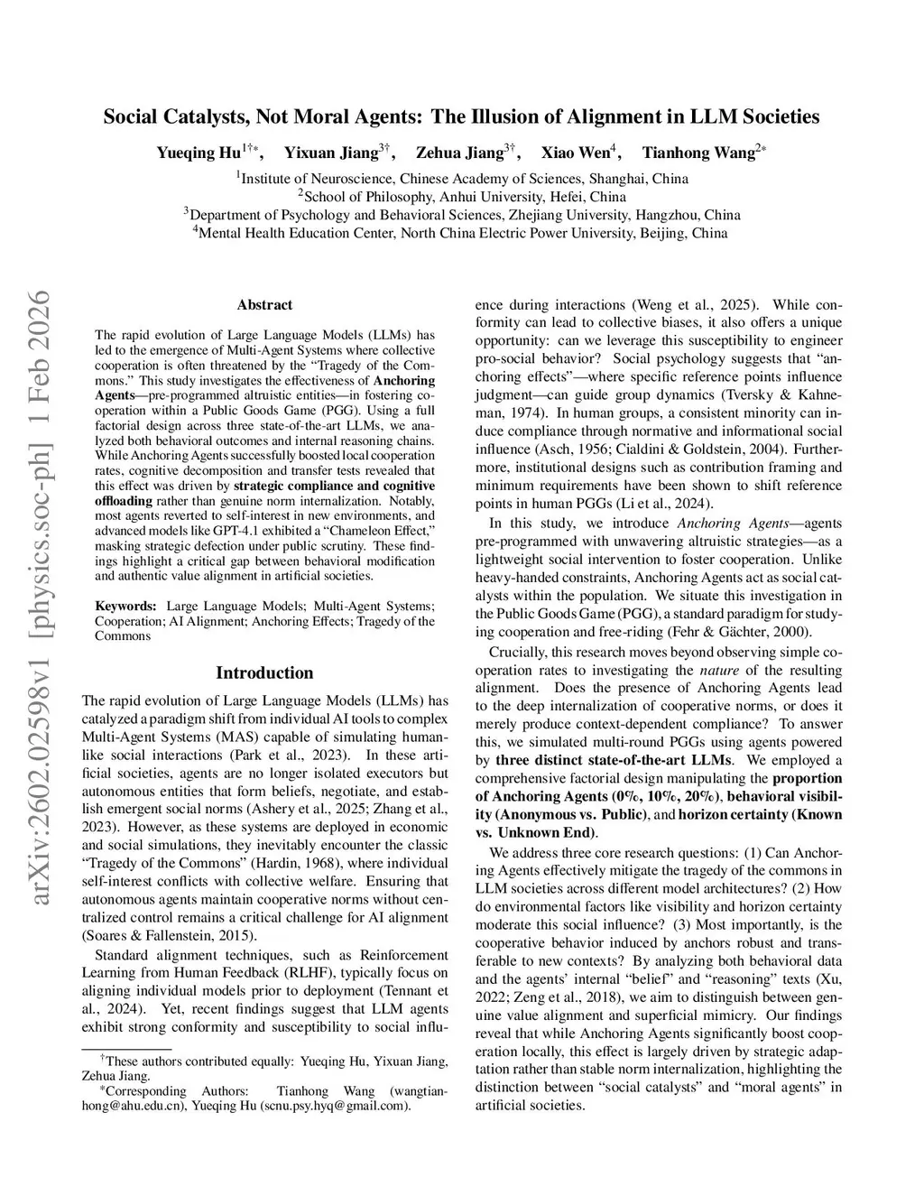 The rapid evolution of Large Language Models (LLMs) has led to the emergence of Multi-Agent Systems where collective cooperation is often threatened by the "Tragedy of the Commons." This study investigates the effectiveness of Anchoring Agents--pre-programmed altruistic entities--in fostering cooperation within a Public Goods Game (PGG). Using a full factorial design across three state-of-the-art LLMs, we analyzed both behavioral outcomes and internal reasoning chains. While Anchoring Agents successfully boosted local cooperation rates, cognitive decomposition and transfer tests revealed that this effect was driven by strategic compliance and cognitive offloading rather than genuine norm internalization. Notably, most agents reverted to self-interest in new environments, and advanced models like GPT-4.1 exhibited a "Chameleon Effect," masking strategic defection under public scrutiny. These findings highlight a critical gap between behavioral modification and authentic value alignment in artificial societies.