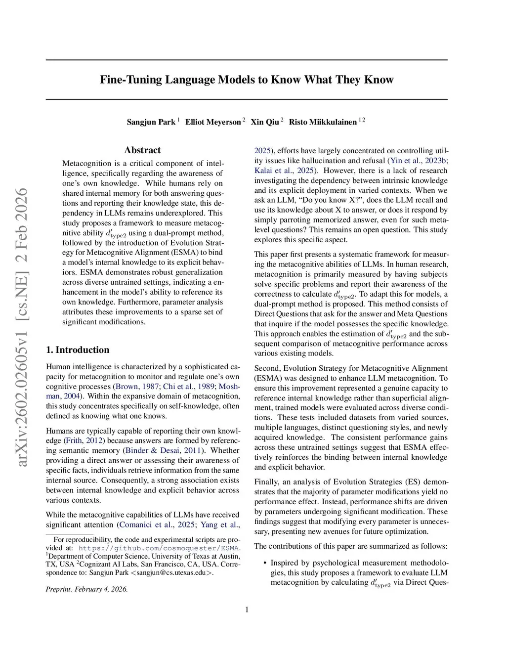Metacognition is a critical component of intelligence, specifically regarding the awareness of one's own knowledge. While humans rely on shared internal memory for both answering questions and reporting their knowledge state, this dependency in LLMs remains underexplored. This study proposes a framework to measure metacognitive ability using a dual-prompt method, followed by the introduction of Evolution Strategy for Metacognitive Alignment (ESMA) to bind a model's internal knowledge to its explicit behaviors. ESMA demonstrates robust generalization across diverse untrained settings, indicating a enhancement in the model's ability to reference its own knowledge. Furthermore, parameter analysis attributes these improvements to a sparse set of significant modifications.