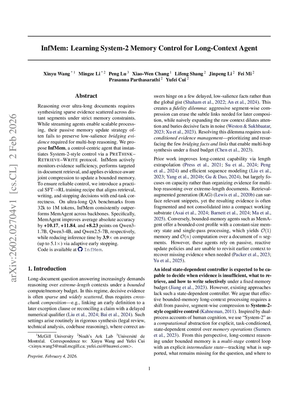 Reasoning over ultra-long documents requires synthesizing sparse evidence scattered across distant segments under strict memory constraints. While streaming agents enable scalable processing, their passive memory update strategy often fails to preserve low-salience bridging evidence required for multi-hop reasoning. We propose InfMem, a control-centric agent that instantiates System-2-style control via a PreThink-Retrieve-Write protocol. InfMem actively monitors evidence sufficiency, performs targeted in-document retrieval, and applies evidence-aware joint compression to update a bounded memory. To ensure reliable control, we introduce a practical SFT-to-RL training recipe that aligns retrieval, writing, and stopping decisions with end-task correctness. On ultra-long QA benchmarks from 32k to 1M tokens, InfMem consistently outperforms MemAgent across backbones. Specifically, InfMem improves average absolute accuracy by +10.17, +11.84, and +8.23 points on Qwen3-1.7B, Qwen3-4B, and Qwen2.5-7B, respectively, while reducing inference time by on average (up to ) via adaptive early stopping.