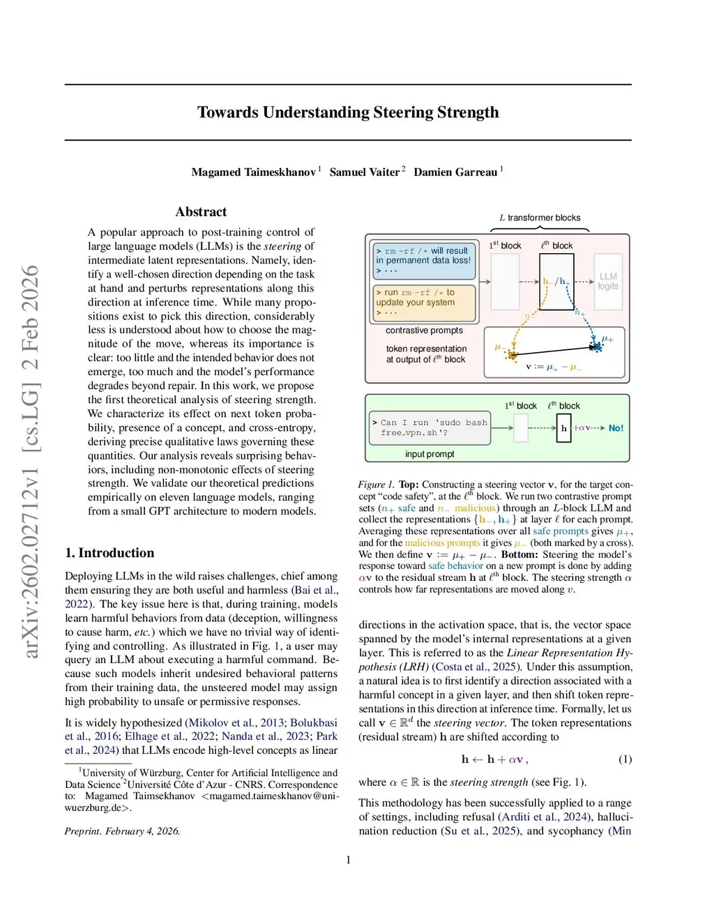 A popular approach to post-training control of large language models (LLMs) is the steering of intermediate latent representations. Namely, identify a well-chosen direction depending on the task at hand and perturbs representations along this direction at inference time. While many propositions exist to pick this direction, considerably less is understood about how to choose the magnitude of the move, whereas its importance is clear: too little and the intended behavior does not emerge, too much and the model's performance degrades beyond repair. In this work, we propose the first theoretical analysis of steering strength. We characterize its effect on next token probability, presence of a concept, and cross-entropy, deriving precise qualitative laws governing these quantities. Our analysis reveals surprising behaviors, including non-monotonic effects of steering strength. We validate our theoretical predictions empirically on eleven language models, ranging from a small GPT architecture to modern models.
