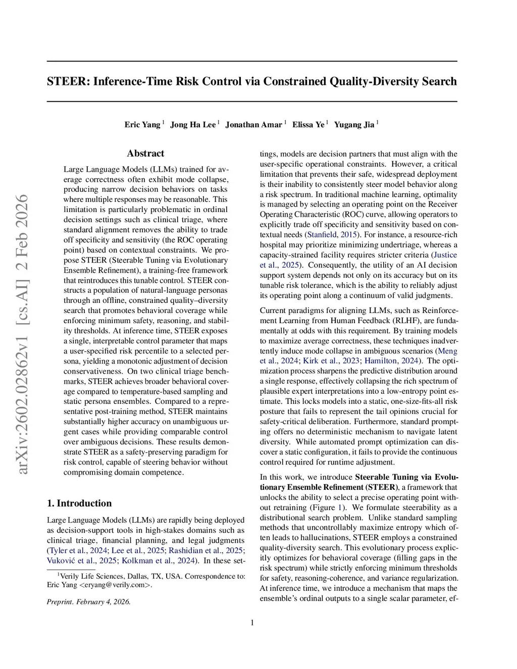 Large Language Models (LLMs) trained for average correctness often exhibit mode collapse, producing narrow decision behaviors on tasks where multiple responses may be reasonable. This limitation is particularly problematic in ordinal decision settings such as clinical triage, where standard alignment removes the ability to trade off specificity and sensitivity (the ROC operating point) based on contextual constraints. We propose STEER (Steerable Tuning via Evolutionary Ensemble Refinement), a training-free framework that reintroduces this tunable control. STEER constructs a population of natural-language personas through an offline, constrained quality-diversity search that promotes behavioral coverage while enforcing minimum safety, reasoning, and stability thresholds. At inference time, STEER exposes a single, interpretable control parameter that maps a user-specified risk percentile to a selected persona, yielding a monotonic adjustment of decision conservativeness. On two clinical triage benchmarks, STEER achieves broader behavioral coverage compared to temperature-based sampling and static persona ensembles. Compared to a representative post-training method, STEER maintains substantially higher accuracy on unambiguous urgent cases while providing comparable control over ambiguous decisions. These results demonstrate STEER as a safety-preserving paradigm for risk control, capable of steering behavior without compromising domain competence.