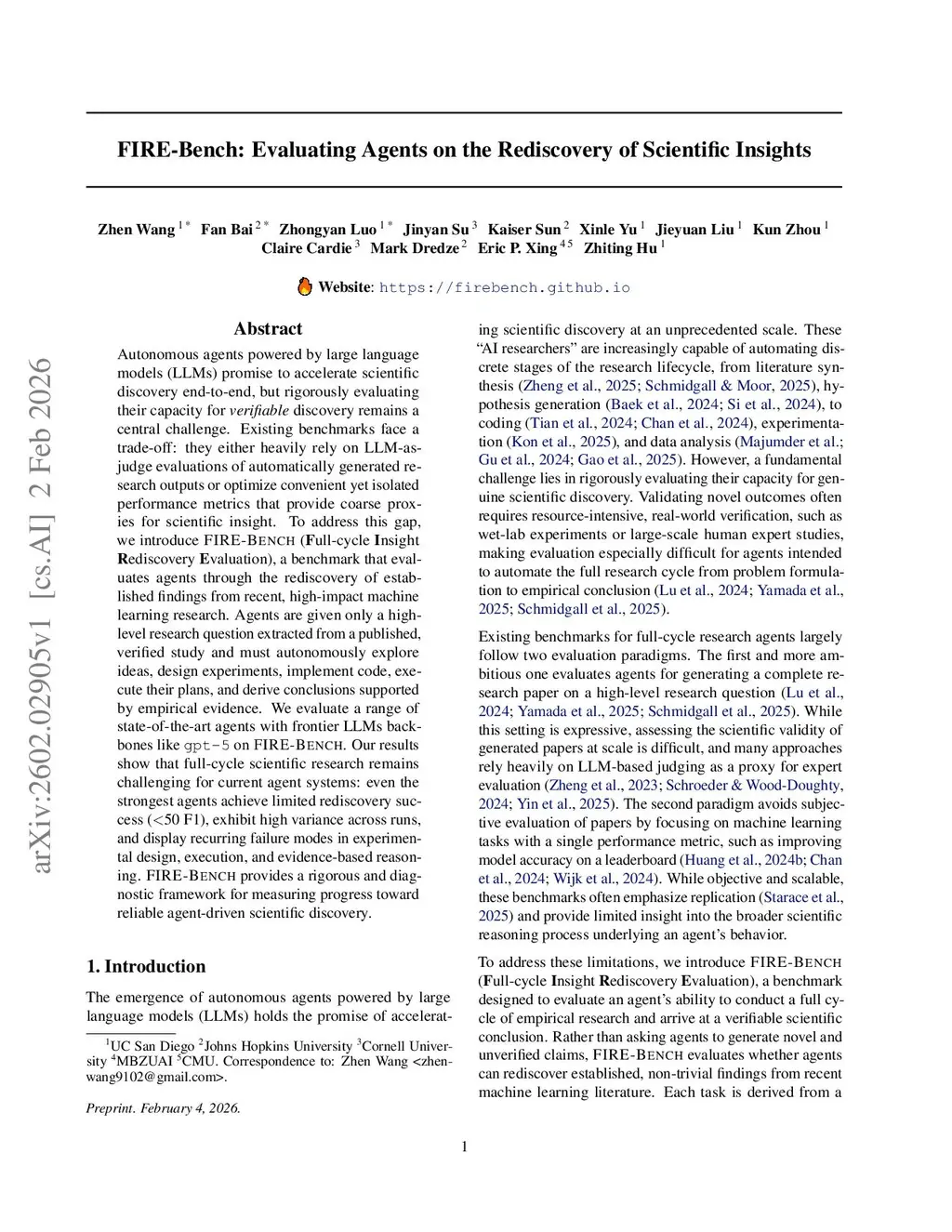 Autonomous agents powered by large language models (LLMs) promise to accelerate scientific discovery end-to-end, but rigorously evaluating their capacity for verifiable discovery remains a central challenge. Existing benchmarks face a trade-off: they either heavily rely on LLM-as-judge evaluations of automatically generated research outputs or optimize convenient yet isolated performance metrics that provide coarse proxies for scientific insight. To address this gap, we introduce FIRE-Bench (Full-cycle Insight Rediscovery Evaluation), a benchmark that evaluates agents through the rediscovery of established findings from recent, high-impact machine learning research. Agents are given only a high-level research question extracted from a published, verified study and must autonomously explore ideas, design experiments, implement code, execute their plans, and derive conclusions supported by empirical evidence. We evaluate a range of state-of-the-art agents with frontier LLMs backbones like gpt-5 on FIRE-Bench. Our results show that full-cycle scientific research remains challenging for current agent systems: even the strongest agents achieve limited rediscovery success (<50 F1), exhibit high variance across runs, and display recurring failure modes in experimental design, execution, and evidence-based reasoning. FIRE-Bench provides a rigorous and diagnostic framework for measuring progress toward reliable agent-driven scientific discovery.