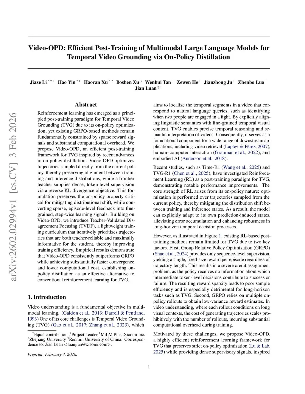 Reinforcement learning has emerged as a principled post-training paradigm for Temporal Video Grounding (TVG) due to its on-policy optimization, yet existing GRPO-based methods remain fundamentally constrained by sparse reward signals and substantial computational overhead. We propose Video-OPD, an efficient post-training framework for TVG inspired by recent advances in on-policy distillation. Video-OPD optimizes trajectories sampled directly from the current policy, thereby preserving alignment between training and inference distributions, while a frontier teacher supplies dense, token-level supervision via a reverse KL divergence objective. This formulation preserves the on-policy property critical for mitigating distributional shift, while converting sparse, episode-level feedback into fine-grained, step-wise learning signals. Building on Video-OPD, we introduce Teacher-Validated Disagreement Focusing (TVDF), a lightweight training curriculum that iteratively prioritizes trajectories that are both teacher-reliable and maximally informative for the student, thereby improving training efficiency. Empirical results demonstrate that Video-OPD consistently outperforms GRPO while achieving substantially faster convergence and lower computational cost, establishing on-policy distillation as an effective alternative to conventional reinforcement learning for TVG.