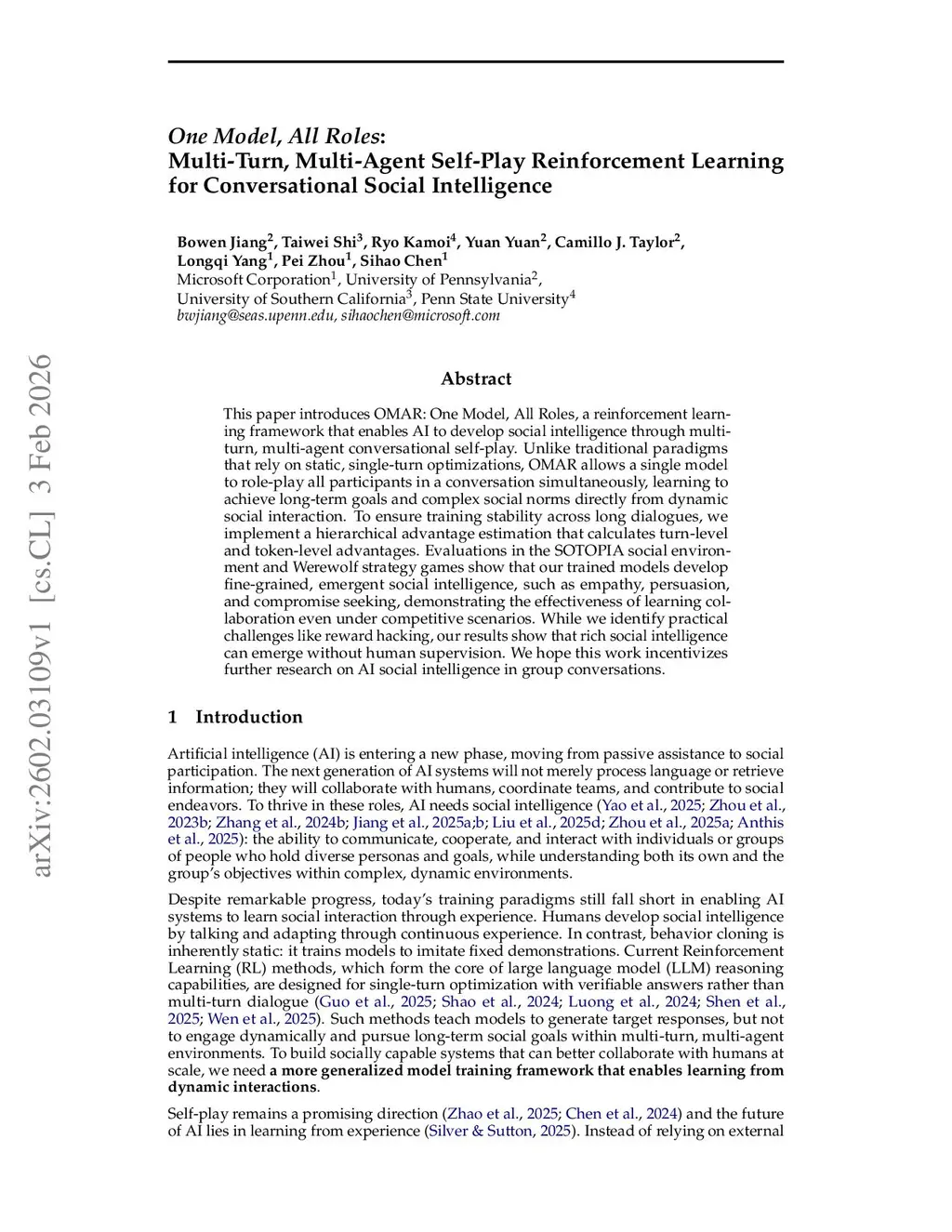 This paper introduces OMAR: One Model, All Roles, a reinforcement learning framework that enables AI to develop social intelligence through multi-turn, multi-agent conversational self-play. Unlike traditional paradigms that rely on static, single-turn optimizations, OMAR allows a single model to role-play all participants in a conversation simultaneously, learning to achieve long-term goals and complex social norms directly from dynamic social interaction. To ensure training stability across long dialogues, we implement a hierarchical advantage estimation that calculates turn-level and token-level advantages. Evaluations in the SOTOPIA social environment and Werewolf strategy games show that our trained models develop fine-grained, emergent social intelligence, such as empathy, persuasion, and compromise seeking, demonstrating the effectiveness of learning collaboration even under competitive scenarios. While we identify practical challenges like reward hacking, our results show that rich social intelligence can emerge without human supervision. We hope this work incentivizes further research on AI social intelligence in group conversations.