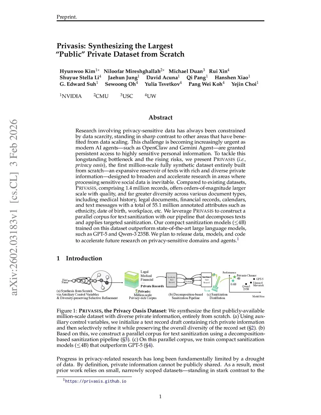 Research involving privacy-sensitive data has always been constrained by data scarcity, standing in sharp contrast to other areas that have benefited from data scaling. This challenge is becoming increasingly urgent as modern AI agents--such as OpenClaw and Gemini Agent--are granted persistent access to highly sensitive personal information. To tackle this longstanding bottleneck and the rising risks, we present Privasis (i.e., privacy oasis), the first million-scale fully synthetic dataset entirely built from scratch--an expansive reservoir of texts with rich and diverse private information--designed to broaden and accelerate research in areas where processing sensitive social data is inevitable. Compared to existing datasets, Privasis, comprising 1.4 million records, offers orders-of-magnitude larger scale with quality, and far greater diversity across various document types, including medical history, legal documents, financial records, calendars, and text messages with a total of 55.1 million annotated attributes such as ethnicity, date of birth, workplace, etc. We leverage Privasis to construct a parallel corpus for text sanitization with our pipeline that decomposes texts and applies targeted sanitization. Our compact sanitization models (<=4B) trained on this dataset outperform state-of-the-art large language models, such as GPT-5 and Qwen-3 235B. We plan to release data, models, and code to accelerate future research on privacy-sensitive domains and agents.