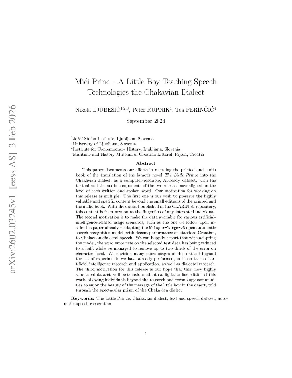 This paper documents our efforts in releasing the printed and audio book of the translation of the famous novel The Little Prince into the Chakavian dialect, as a computer-readable, AI-ready dataset, with the textual and the audio components of the two releases now aligned on the level of each written and spoken word. Our motivation for working on this release is multiple. The first one is our wish to preserve the highly valuable and specific content beyond the small editions of the printed and the audio book. With the dataset published in thethis http URLrepository, this content is from now on at the fingertips of any interested individual. The second motivation is to make the data available for various artificial-intelligence-related usage scenarios, such as the one we follow upon inside this paper already -- adapting the Whisper-large-v3 open automatic speech recognition model, with decent performance on standard Croatian, to Chakavian dialectal speech. We can happily report that with adapting the model, the word error rate on the selected test data has being reduced to a half, while we managed to remove up to two thirds of the error on character level. We envision many more usages of this dataset beyond the set of experiments we have already performed, both on tasks of artificial intelligence research and application, as well as dialectal research. The third motivation for this release is our hope that this, now highly structured dataset, will be transformed into a digital online edition of this work, allowing individuals beyond the research and technology communities to enjoy the beauty of the message of the little boy in the desert, told through the spectacular prism of the Chakavian dialect.